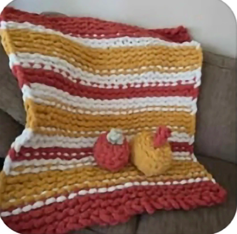 Selling a cozy handmade knitted throw blanket! It features stripes of coral, white, and gold. There are also two cute knitted balls, one coral and one gold, that come with it. Perfect for adding a touch of warmth and color to your home