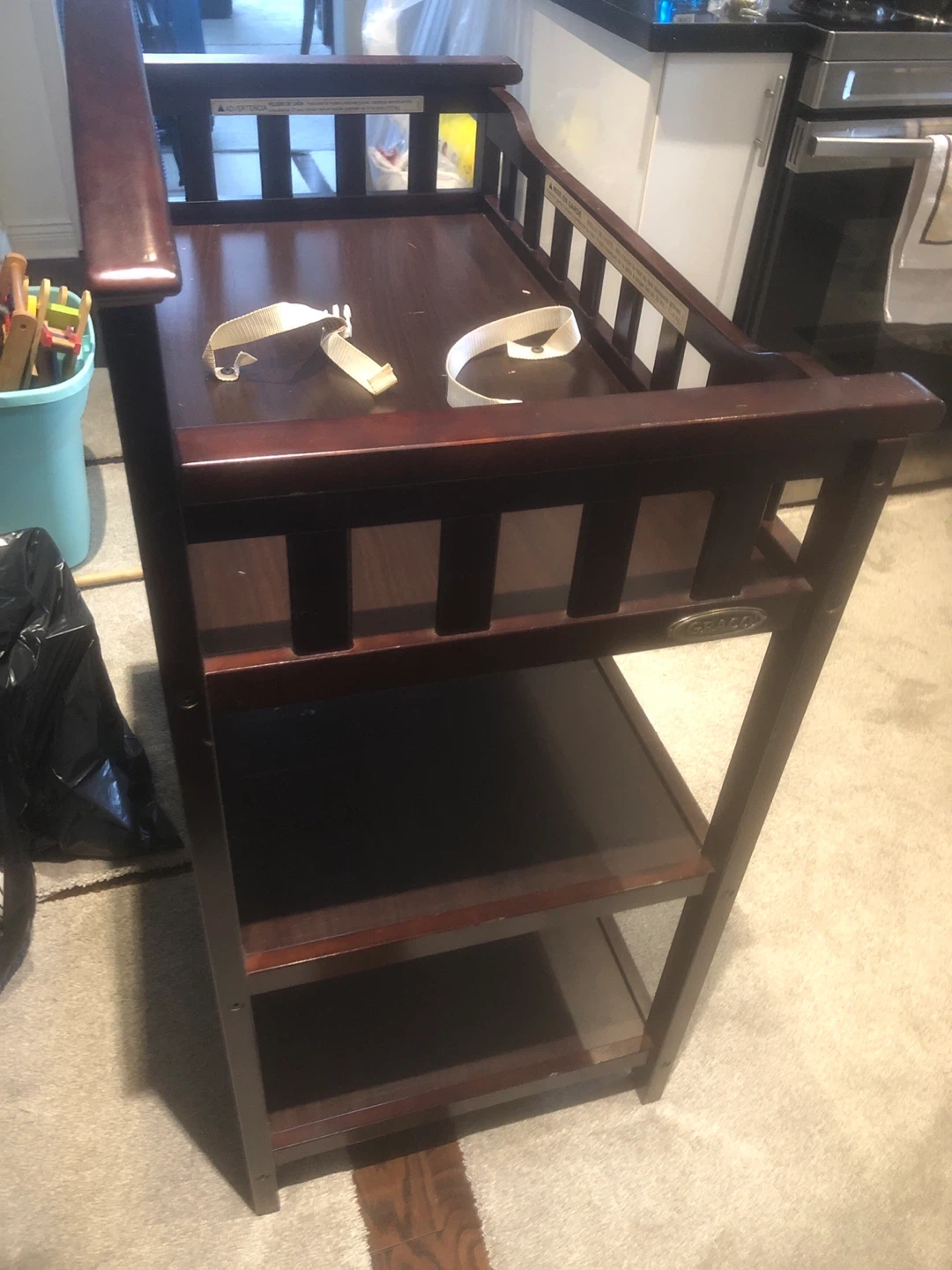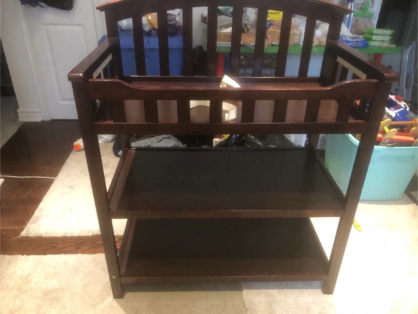 Selling a Graco changing table in a dark wood finish. It has a sturdy design with multiple shelves for storage. Perfect for keeping baby essentials organized and within reach!