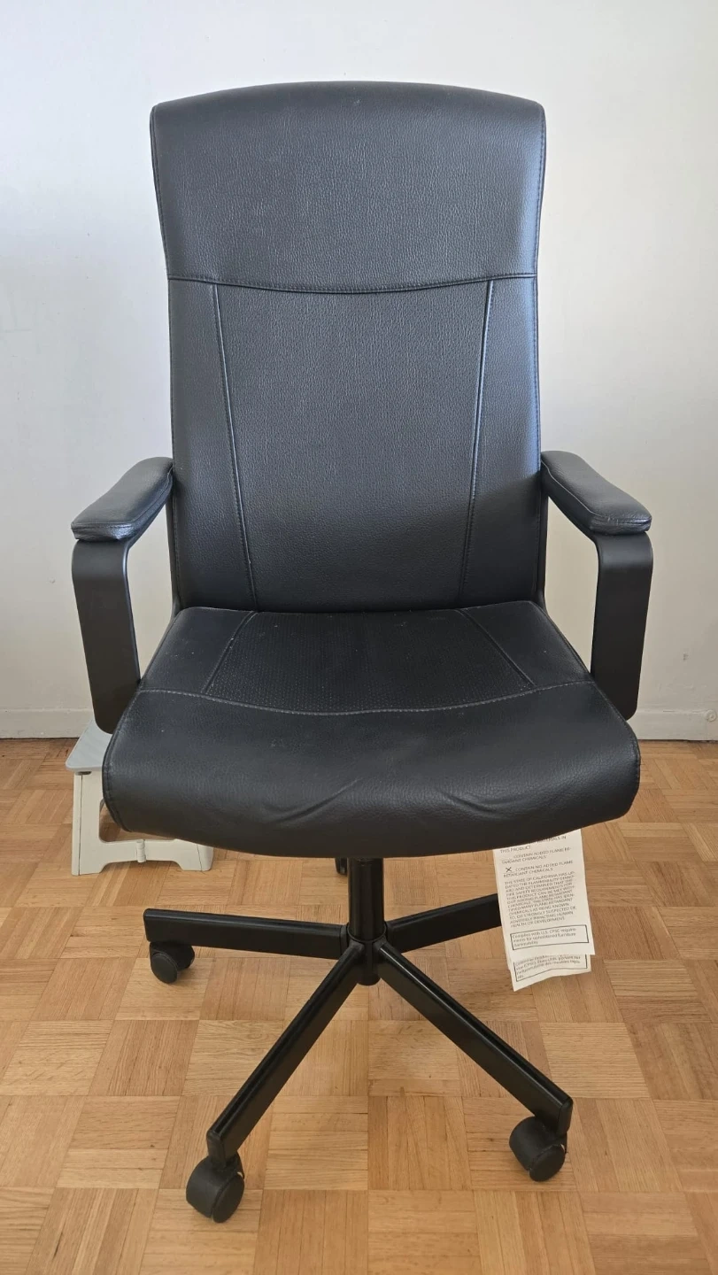 Selling a black office chair that's in good condition. It has a high back and armrests for extra comfort. Perfect for your home office or study space!