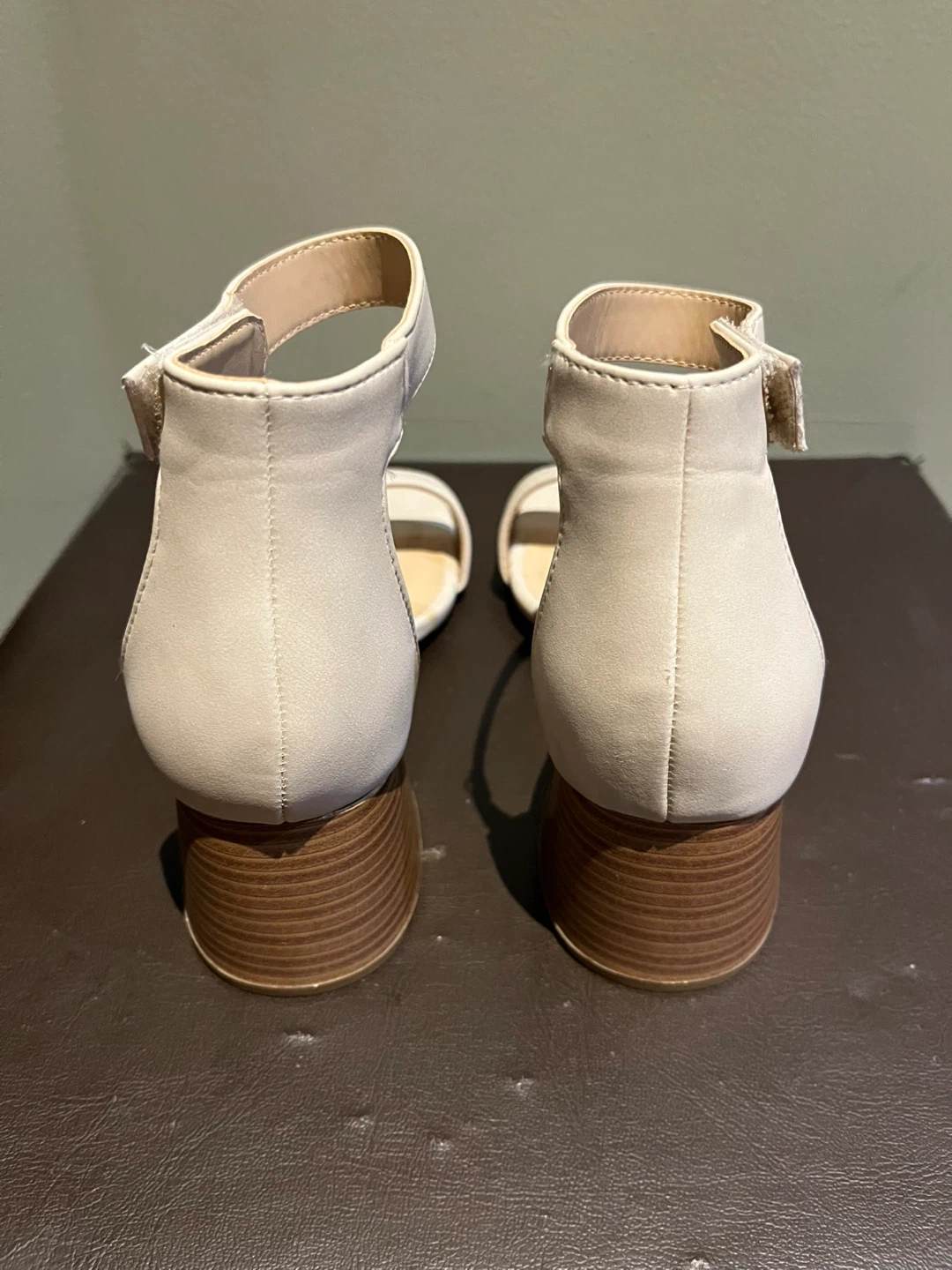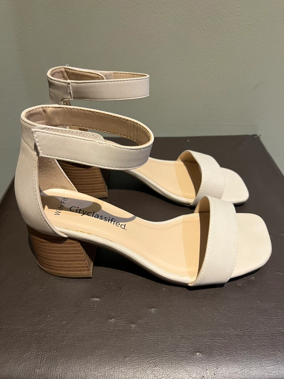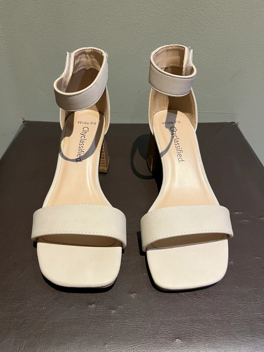 Chic cream heels with velcro ankle strap.