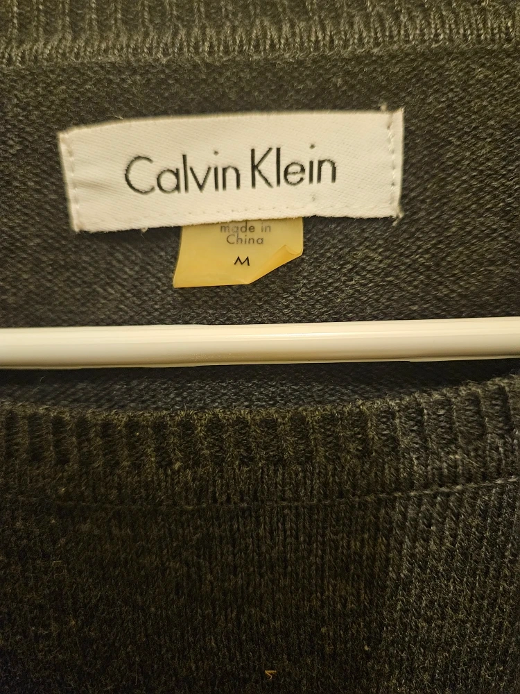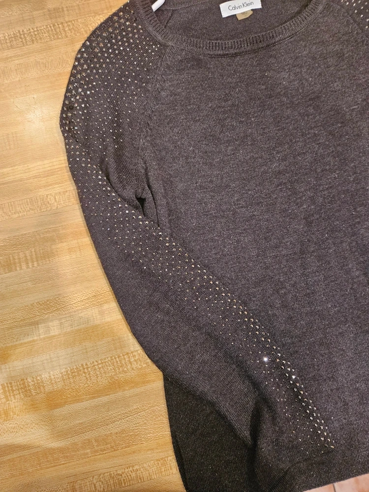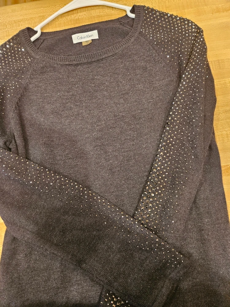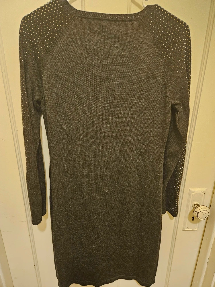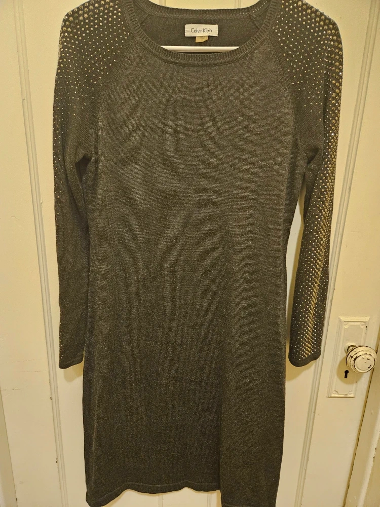 Selling a Calvin Klein gray sweater dress in size medium. It has embellishments on the sleeves and shoulders. It's in great condition and ready for a new owner!