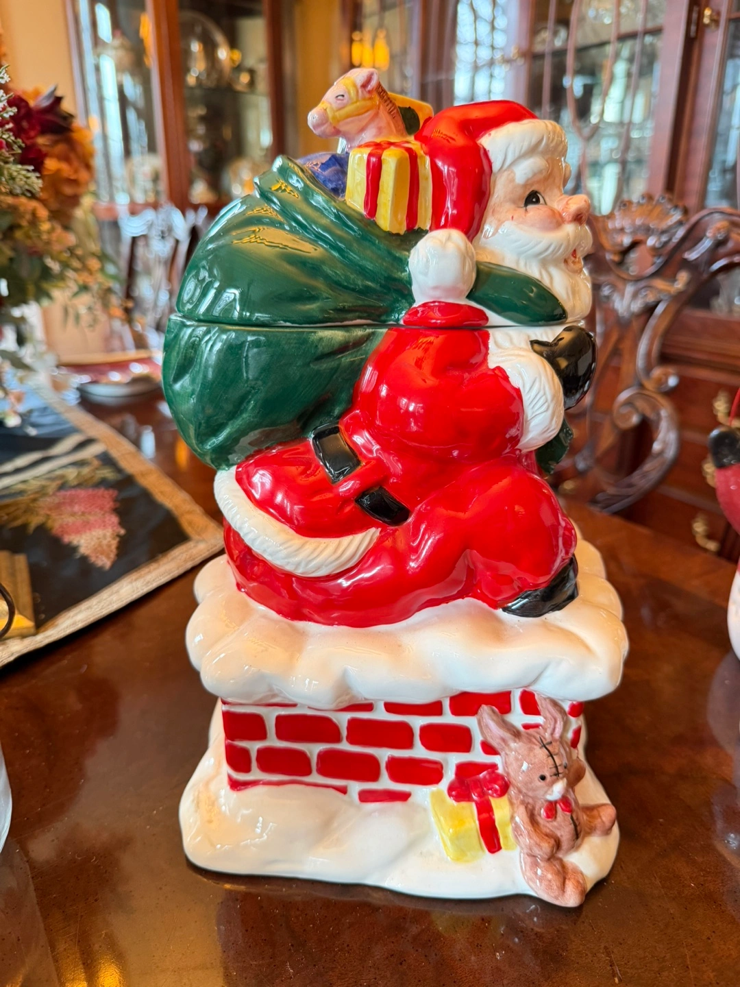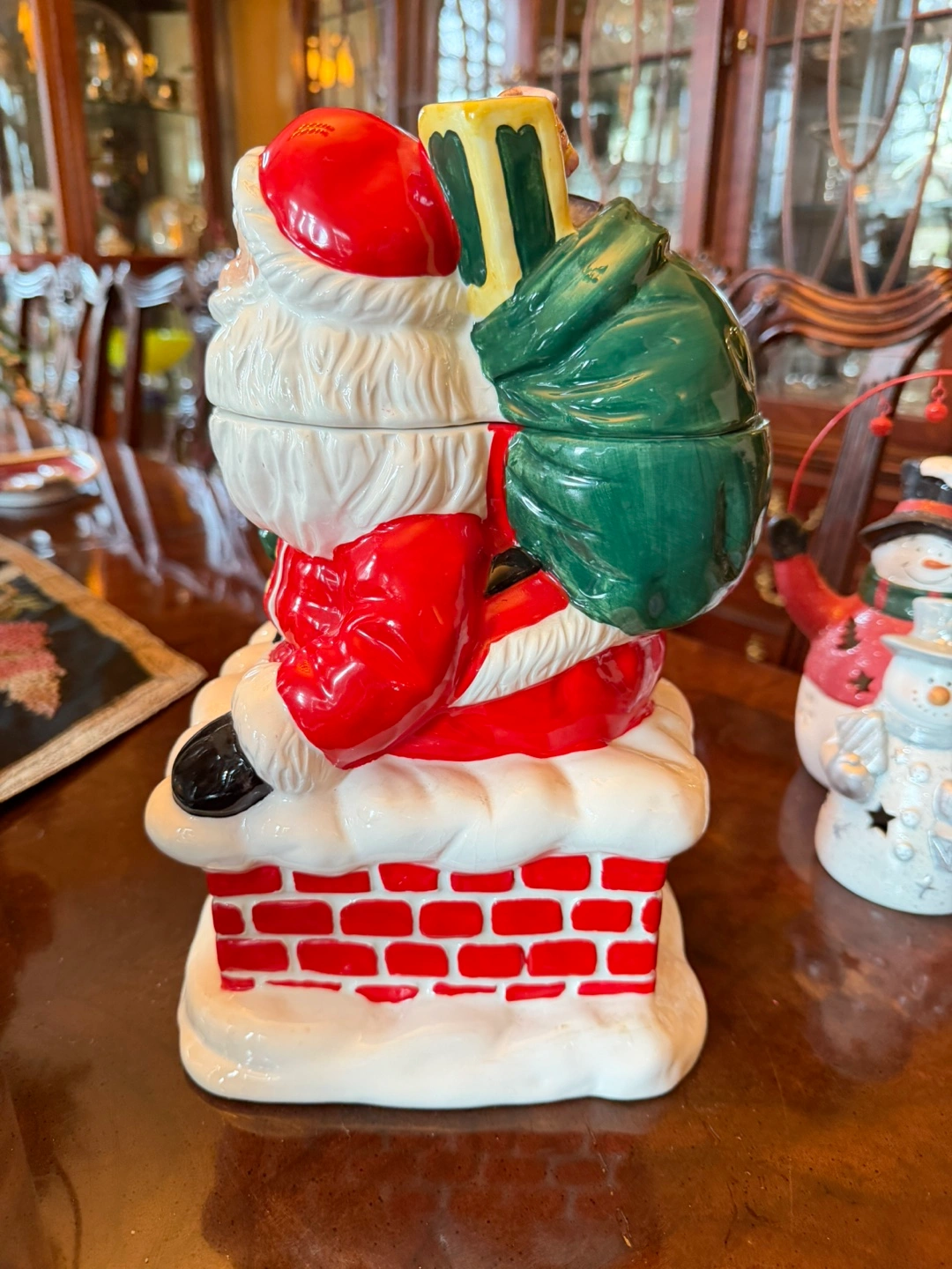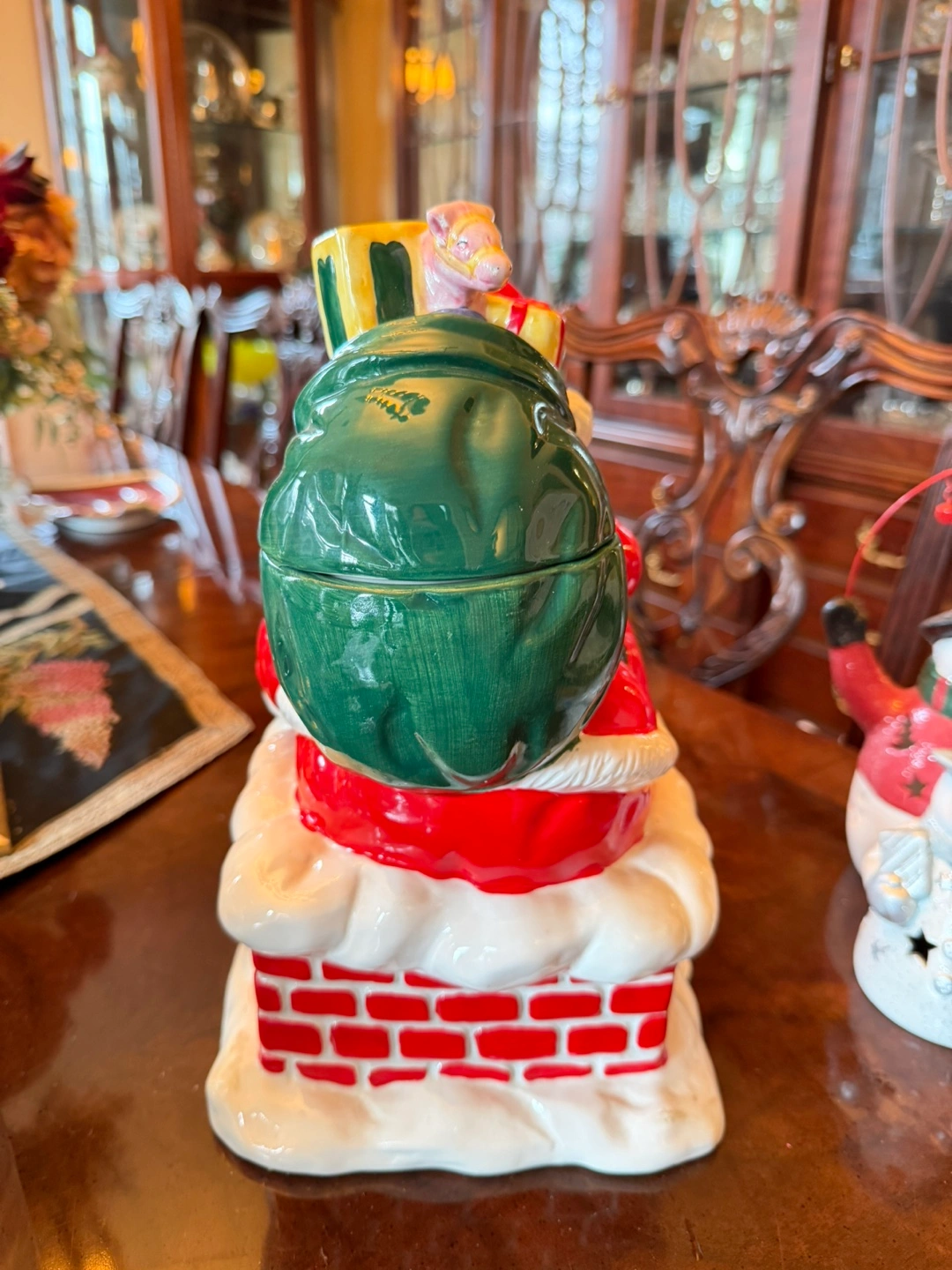 Here's a charming Santa Claus cookie jar by Century! It's designed with Santa climbing down a chimney with a sack full of toys. Perfect for adding a festive touch to your kitchen during the holidays