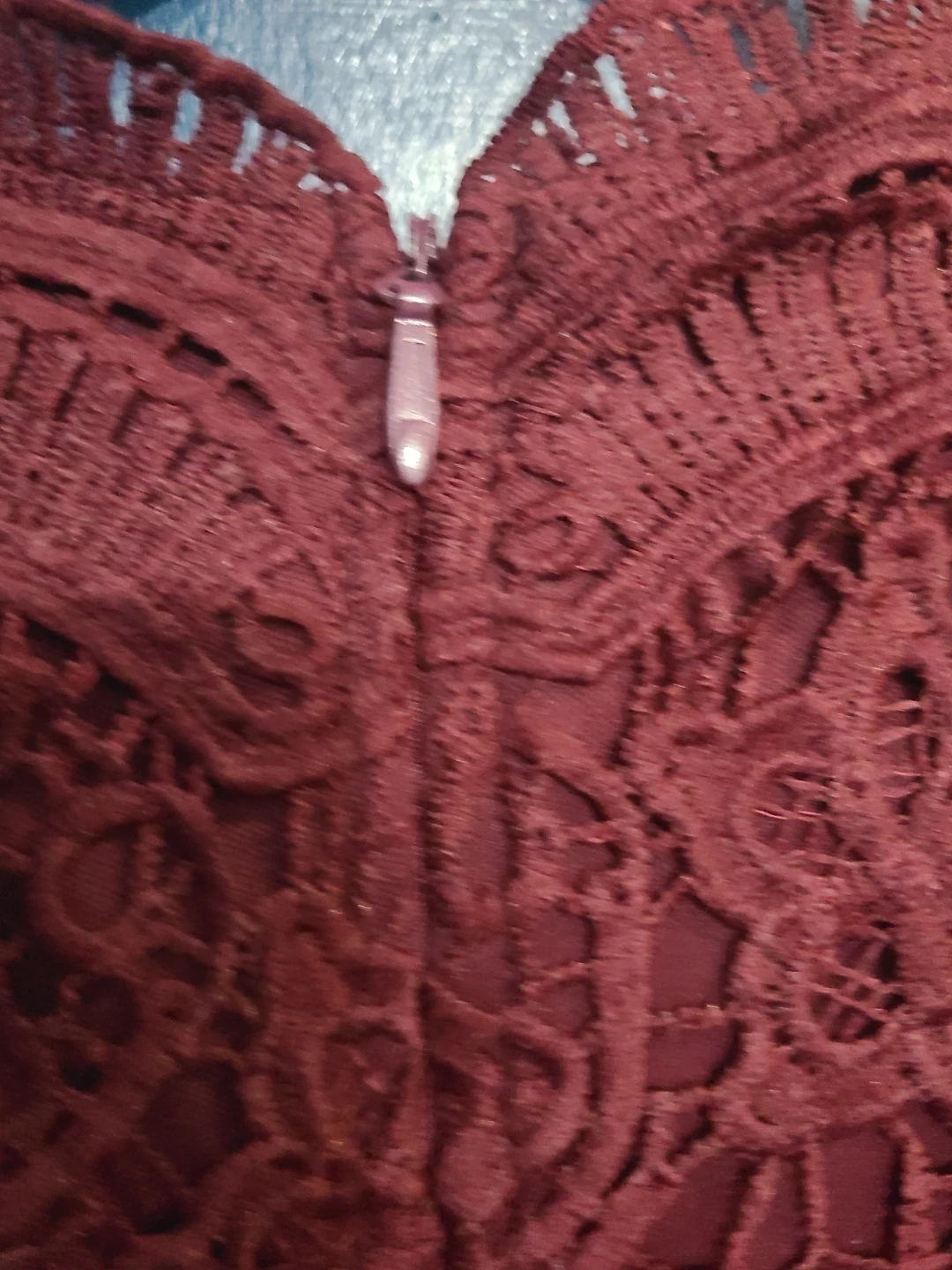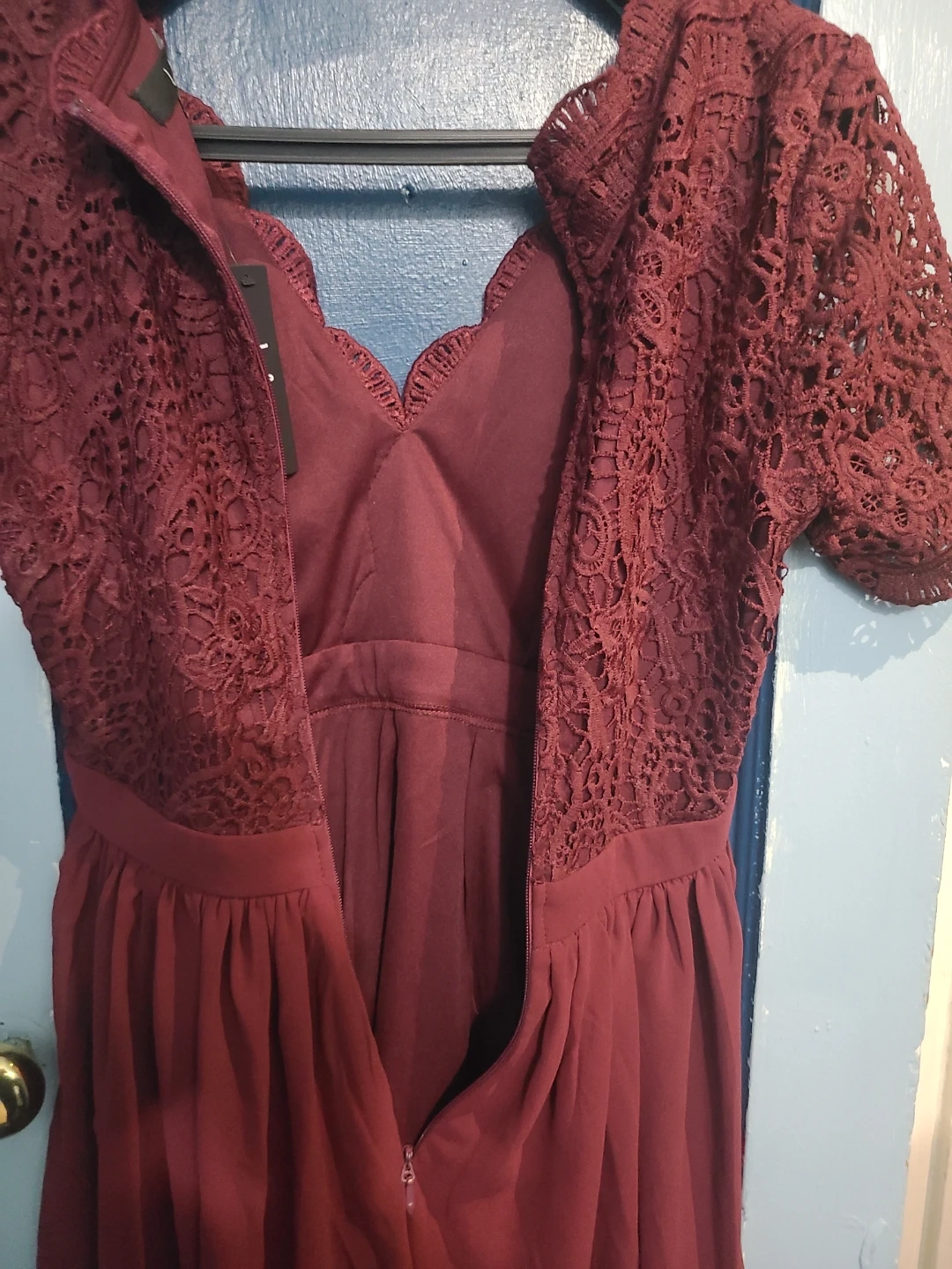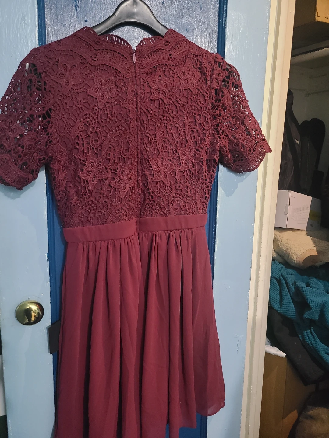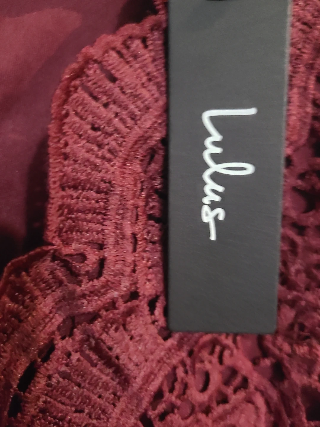 Selling a beautiful Lulus dress in a lovely burgundy color! It features delicate lace detailing on the top and short sleeves, with a flowing skirt. The dress is a size medium. Perfect for a special occasion or a night out!