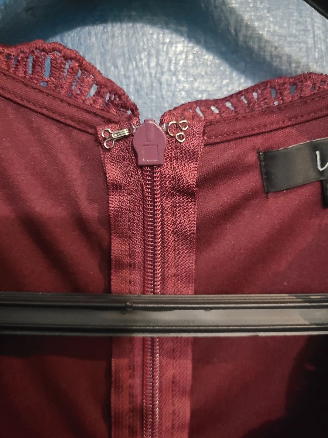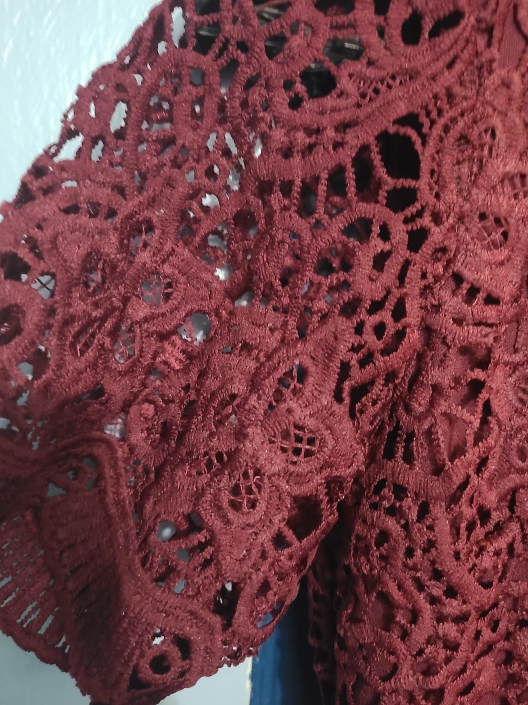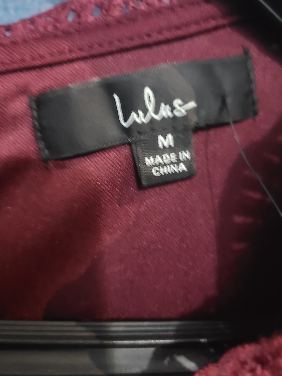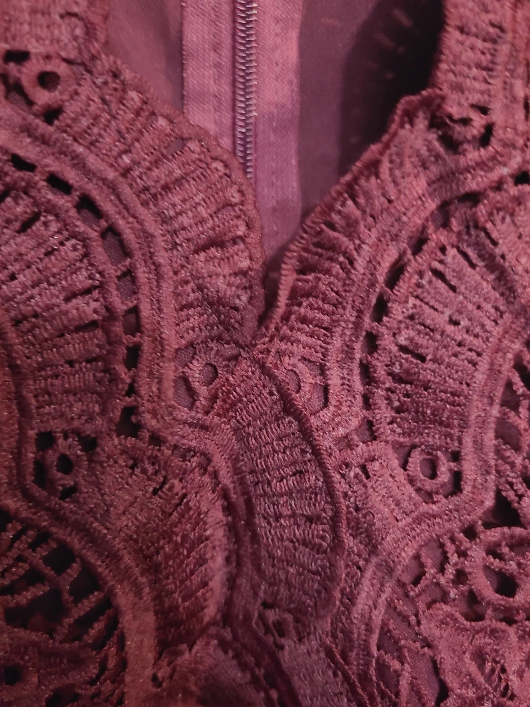 Selling a beautiful Lulus dress in a lovely burgundy color! It features delicate lace detailing on the top and short sleeves, with a flowing skirt. The dress is a size medium. Perfect for a special occasion or a night out!