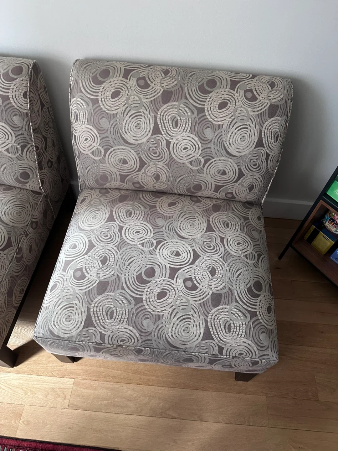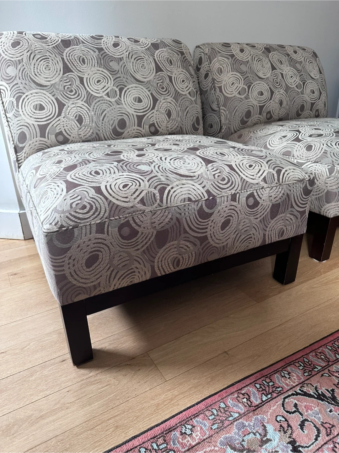 Selling a pair of accent chairs with a unique circular pattern. They're in great condition and would be a stylish addition to any room. Perfect for extra seating or as decorative pieces.