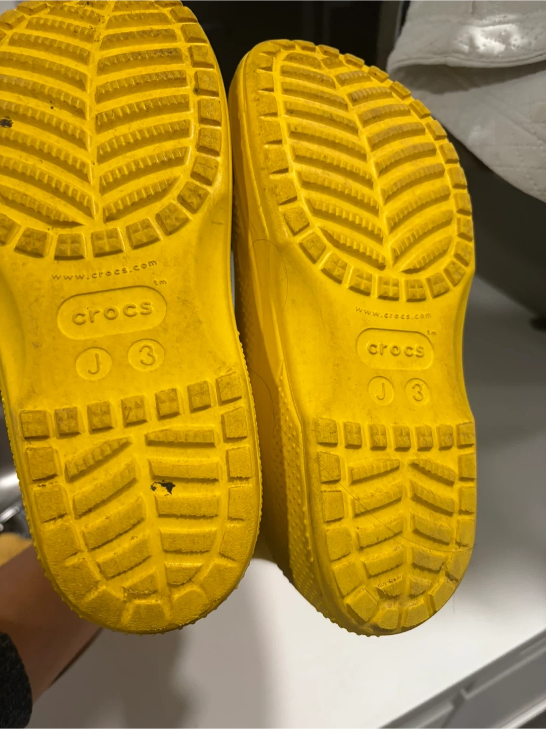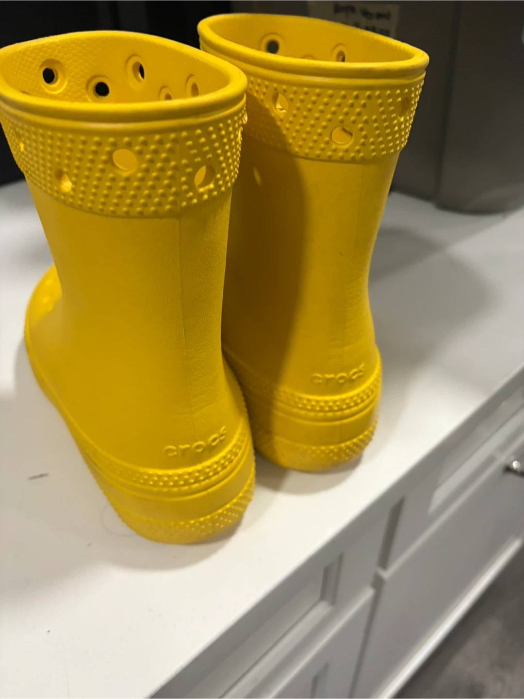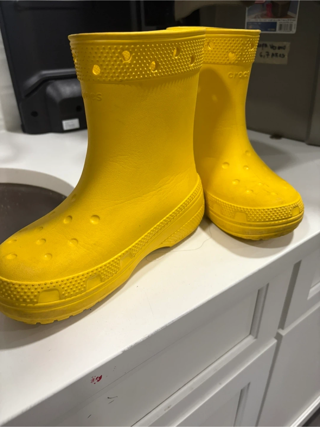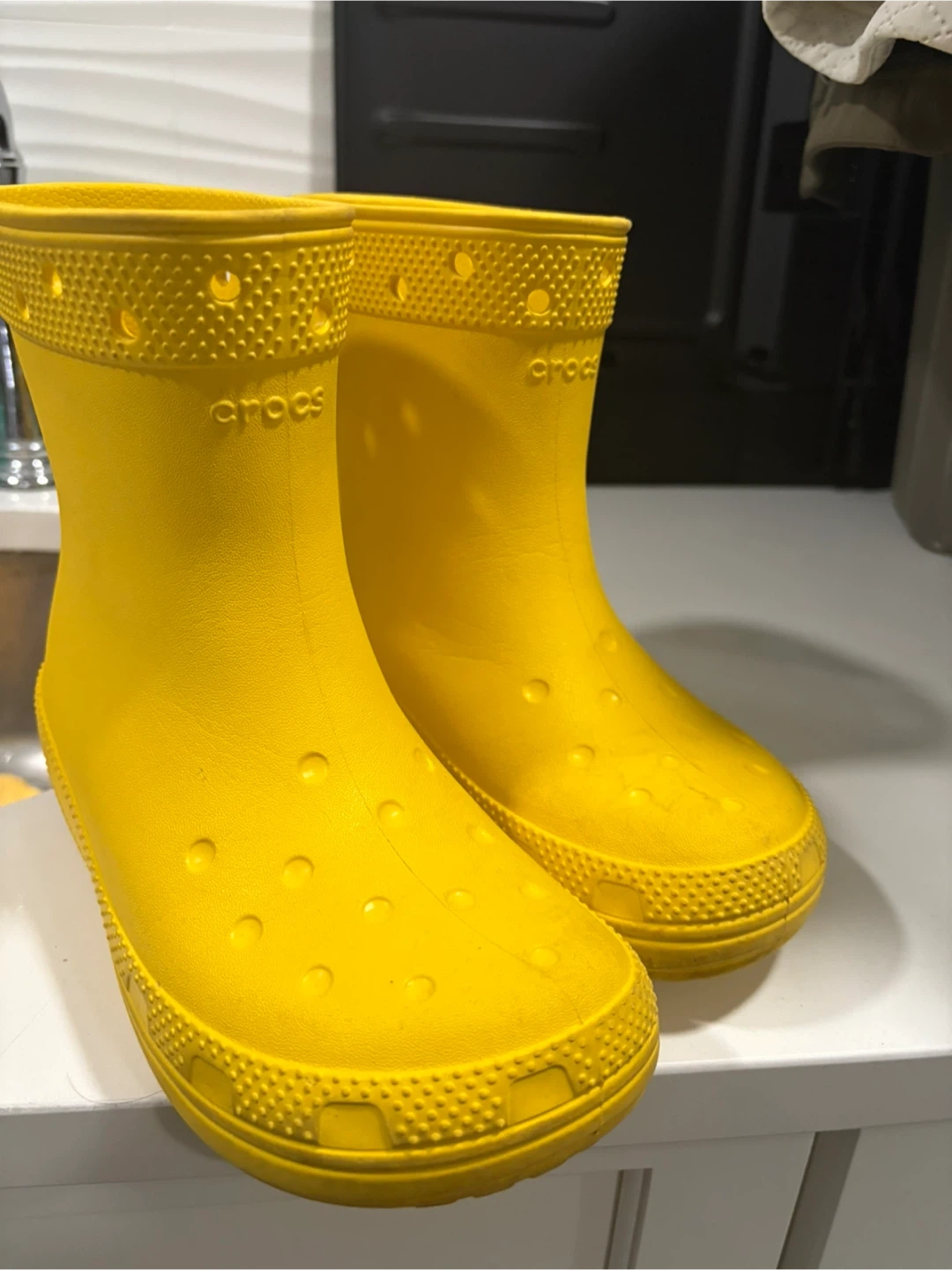 Selling a pair of bright yellow Crocs rain boots in a size J3. These are perfect for keeping little feet dry and stylish on rainy days! They are in good condition and ready for a new adventure.