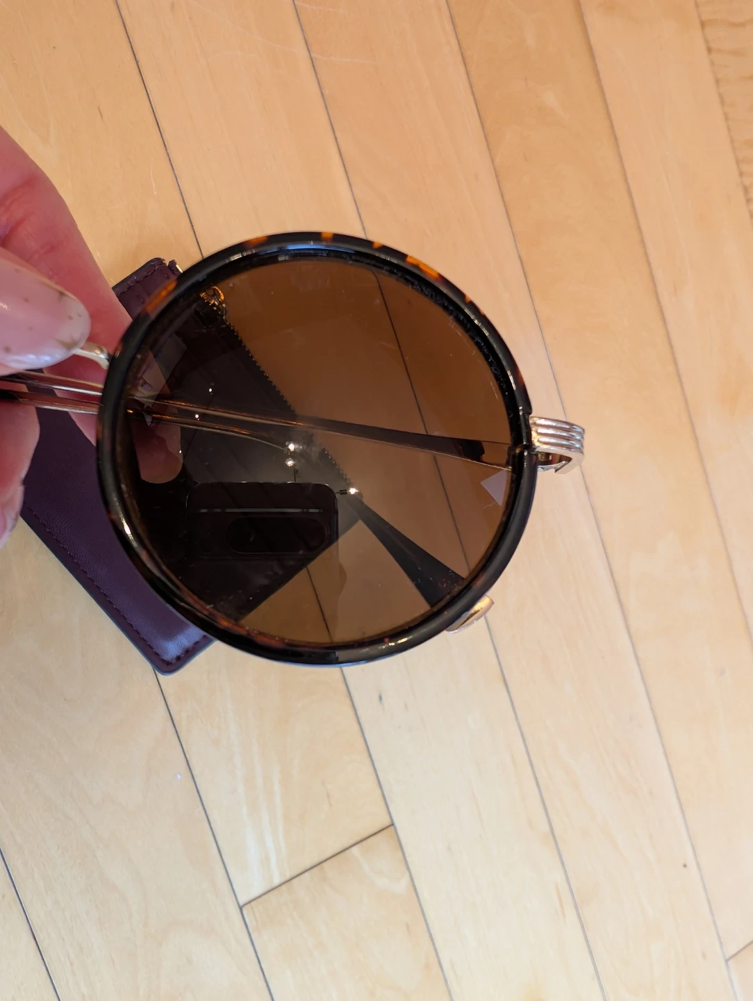 Selling a pair of sunglasses with round, tortoise-shell frames. They have a stylish, vintage look. Also including a burgundy wallet with a zippered compartment.