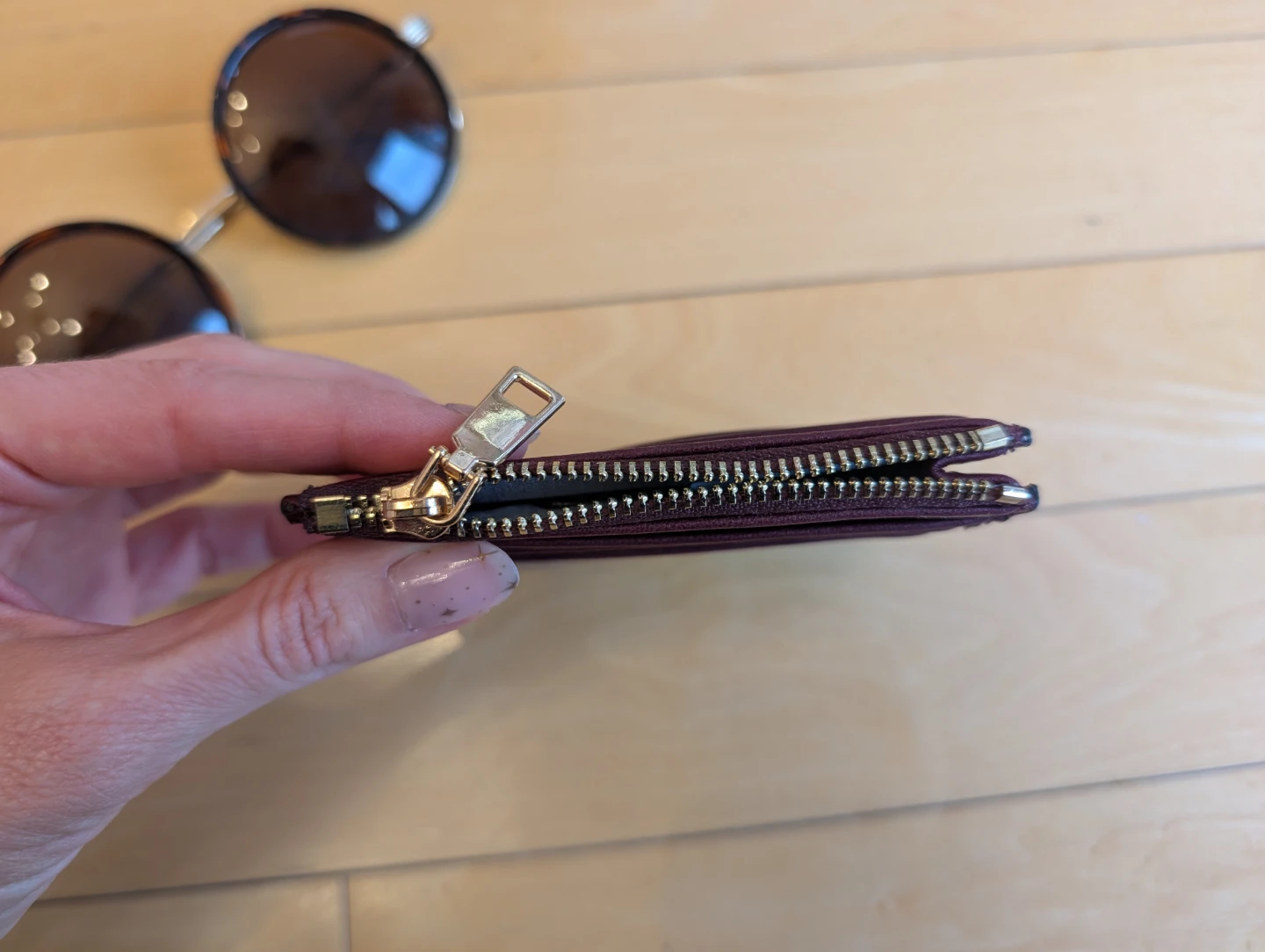 The glasses are scuffed and the wallet zipper is hard to open/close.