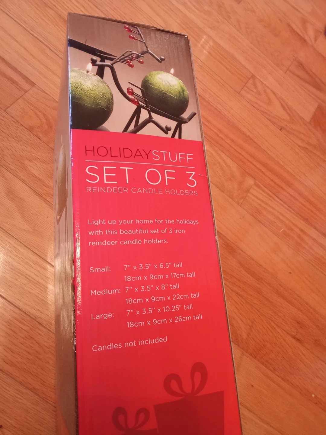 Selling a Holidaystuff set of 3 reindeer candle holders. The box includes a beautiful set of 3 iron reindeer candle holders.