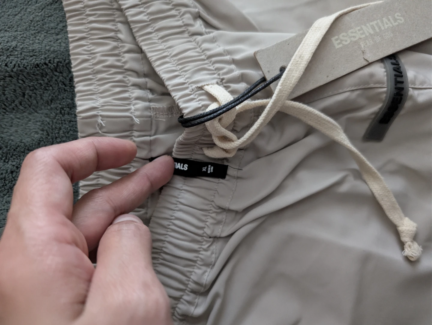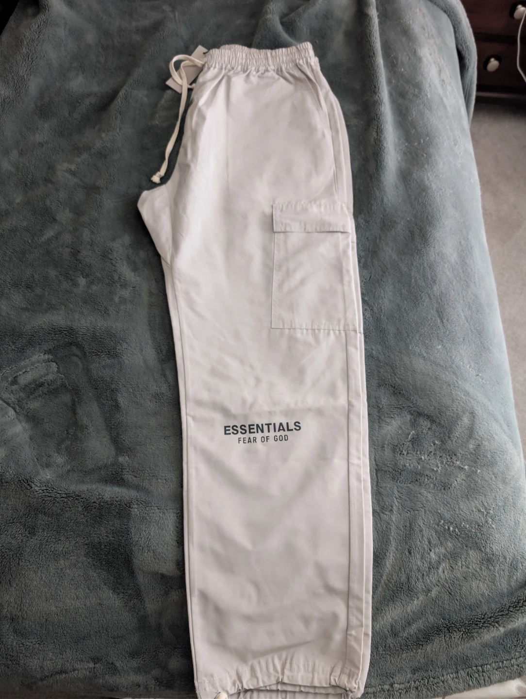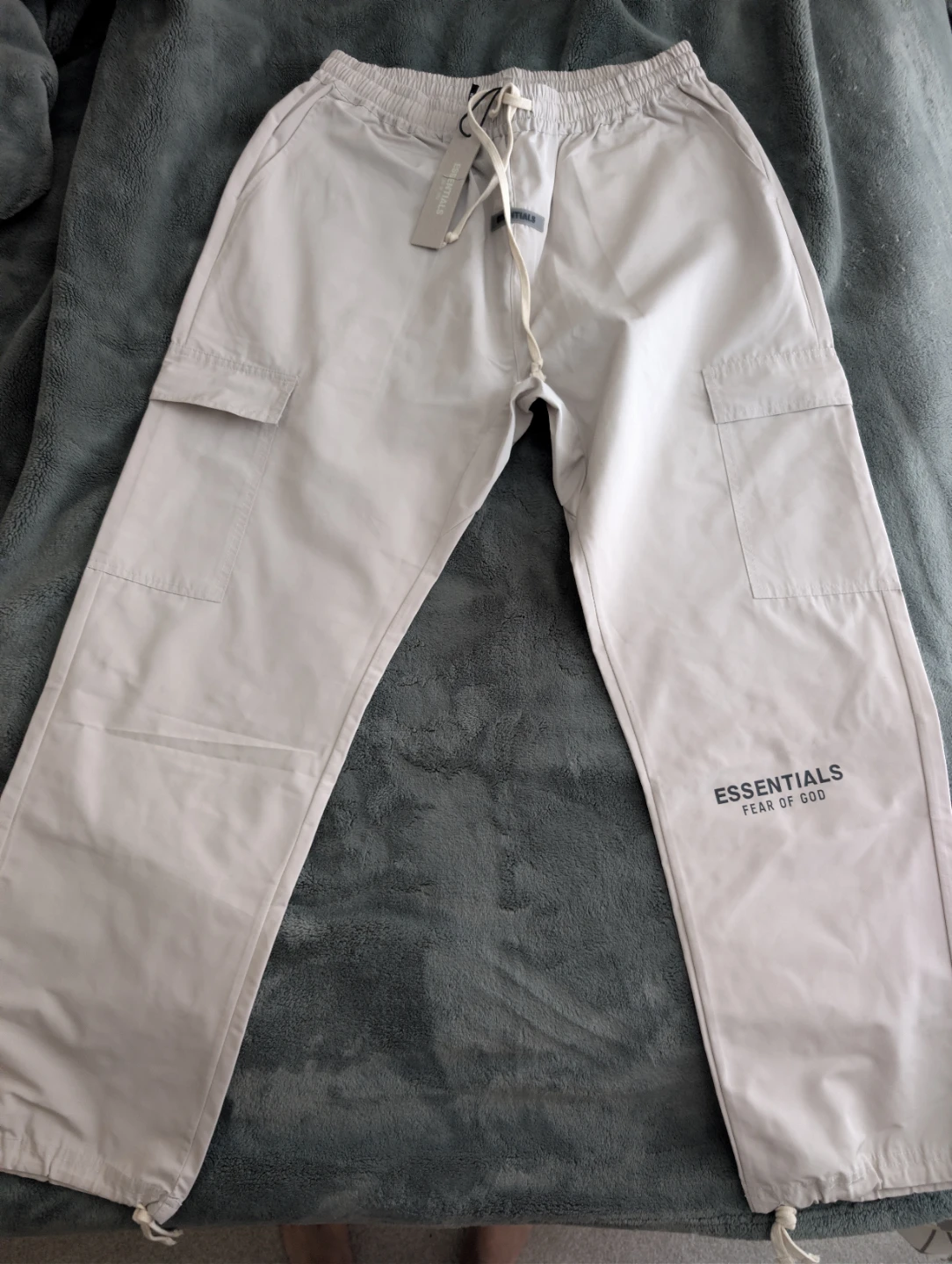 These are brand new Essentials Fear of God cargo pants in size XL. They're a stylish and comfortable addition to any wardrobe!
