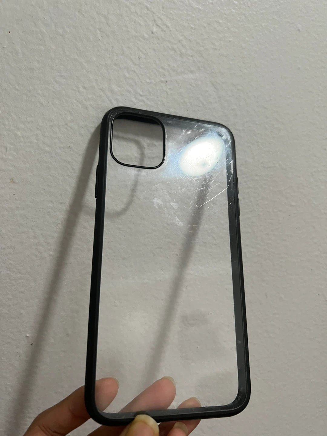 Selling a used iPhone case with a black border. It's transparent in the middle, so you can still show off your phone's color. It has some scratches from normal use.