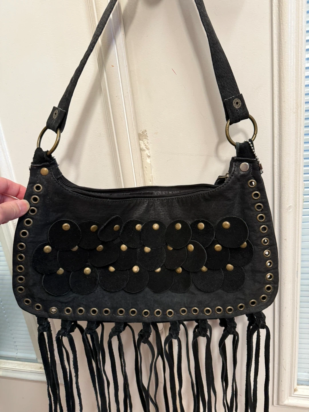 Check out this stylish black suede shoulder bag! It features unique embellishments and a fun fringe detail. It's in great condition and ready for a new owner!