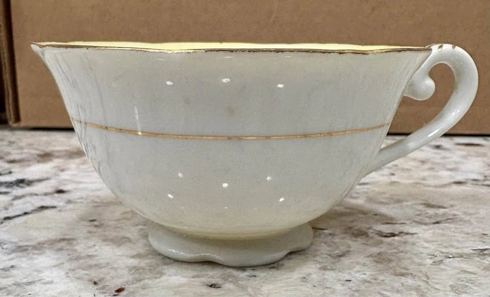 I have no background information on this teacup. It’s an inherited item. I do not believe that I have the saucer so I’m selling it as tea cup only. It is still quite lovely. I know it is very old. They do not appear to be any chips or rub spots or wear spots on this teacup.