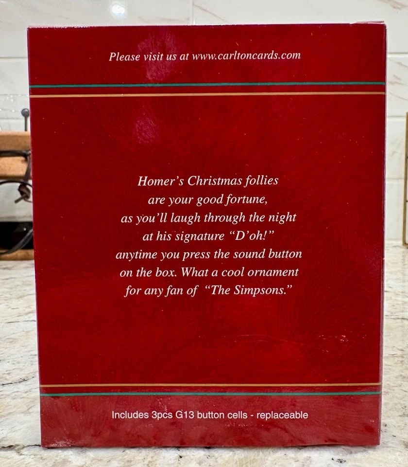 Brand new Homer Simpson Christmas ornament. Purchased in 2003 never displayed. It is a talking ornament, but of course the batteries have died. They are replaceable. It would take 3 G13 button batteries. I have confirmed that they are replaceable.