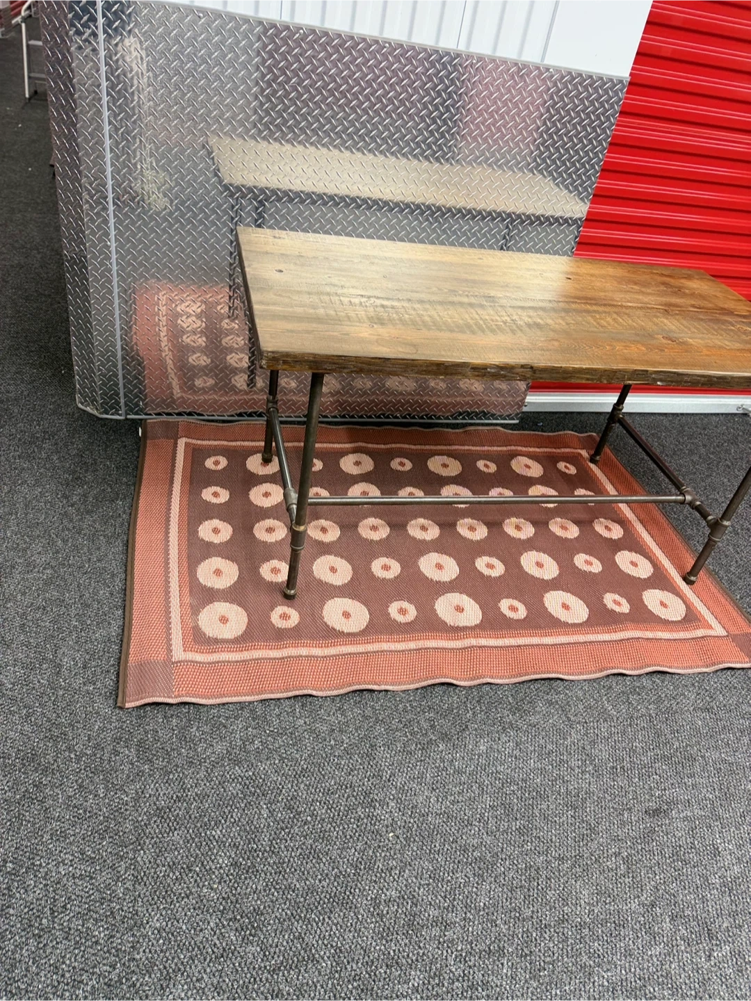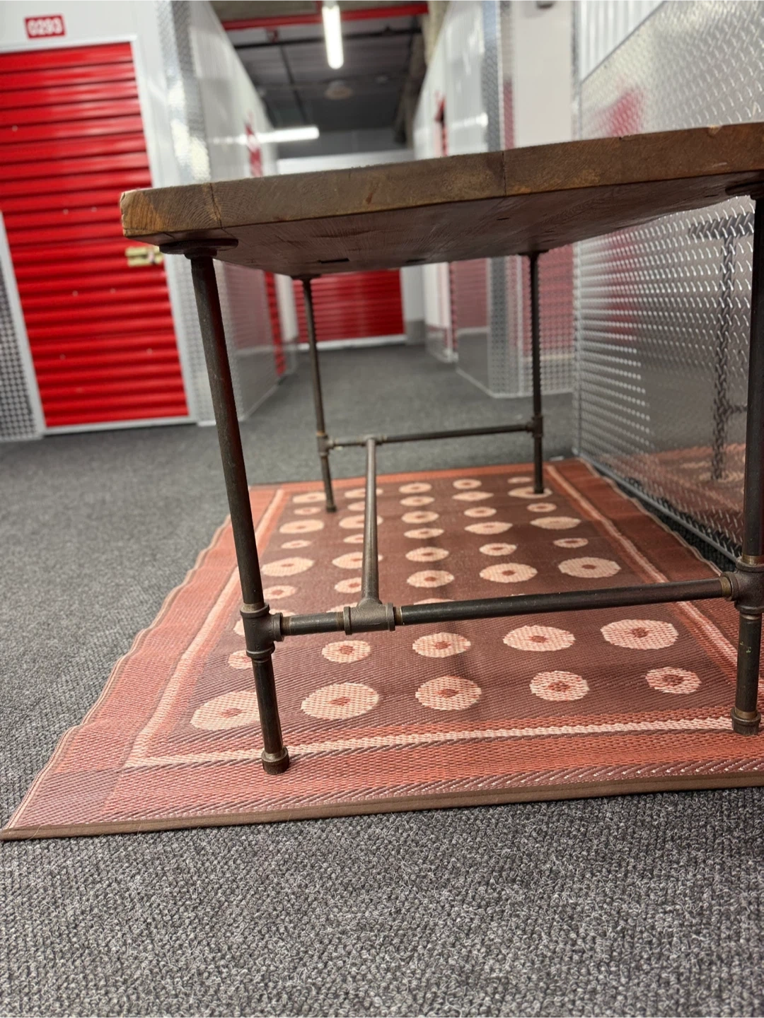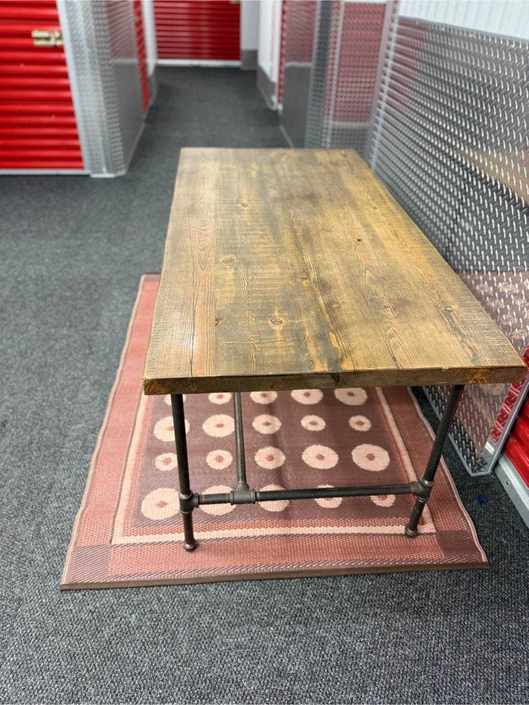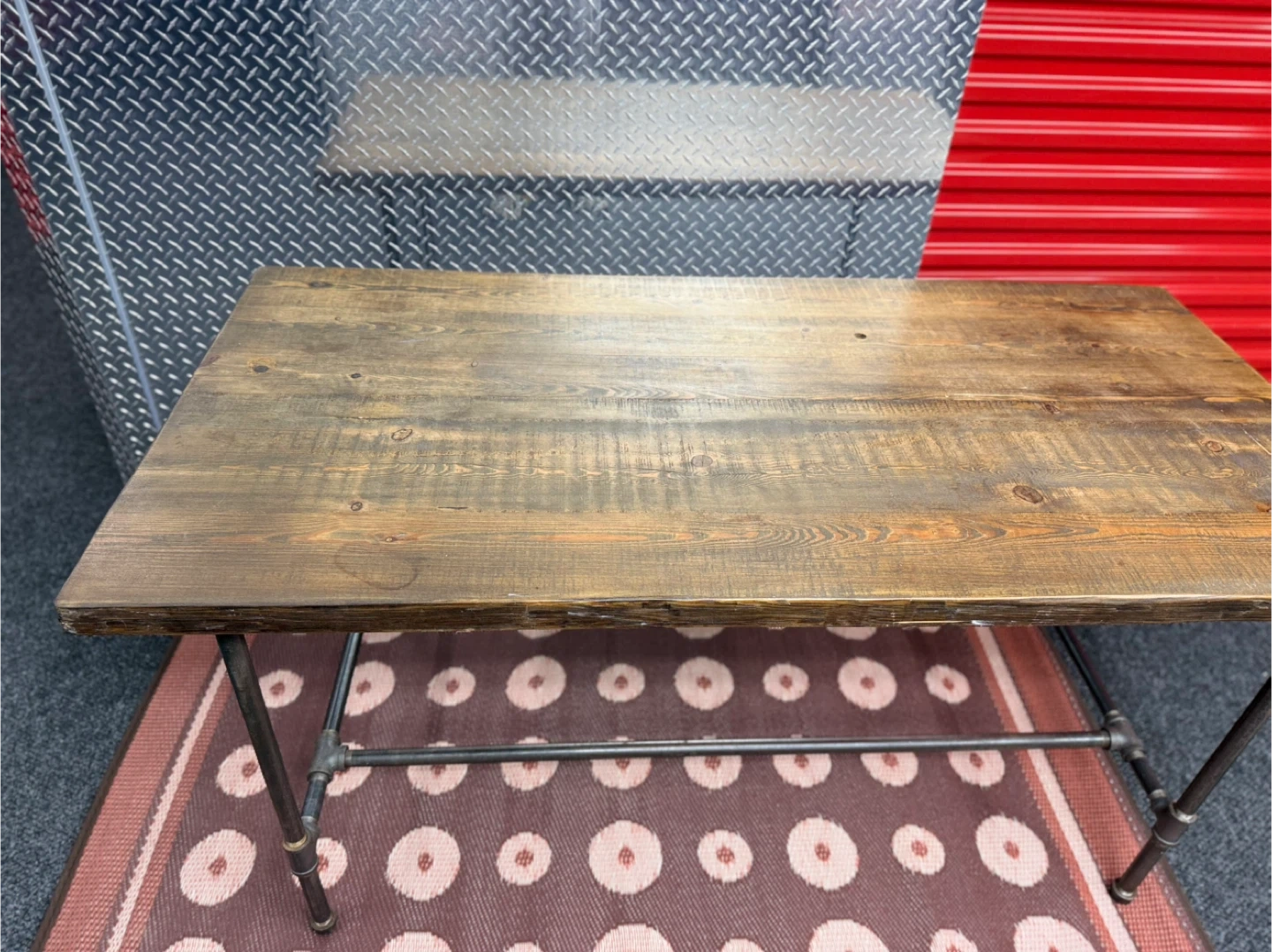 This is a sturdy and stylish desk featuring a rustic wood top and metal pipe legs. It would be a great addition to any home office or workspace. The desk has a unique industrial look that's sure to impress!