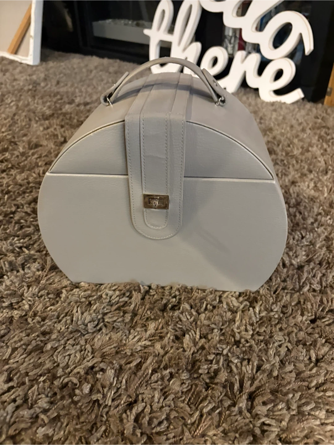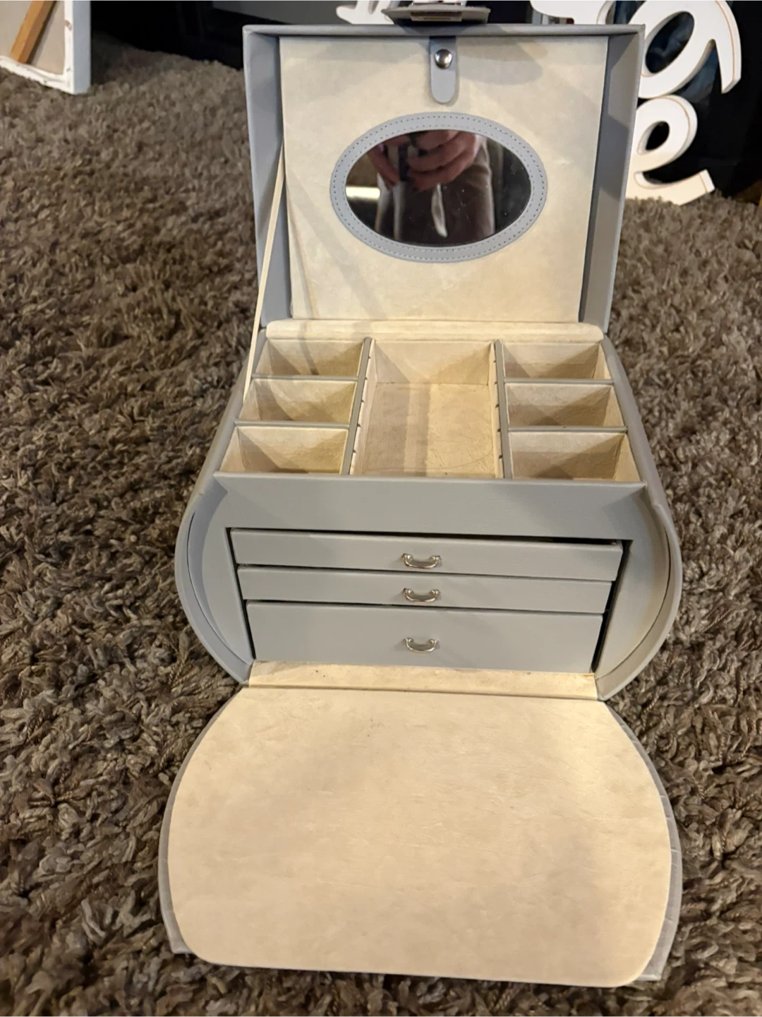 This gray jewelry box is perfect for storing your precious items! It features multiple compartments and drawers to keep your jewelry organized and safe. It's in great condition and ready to be used