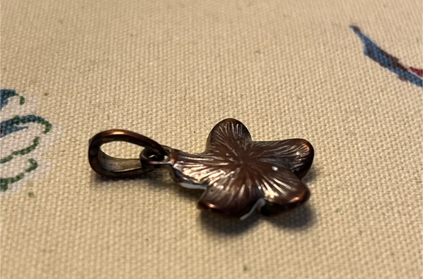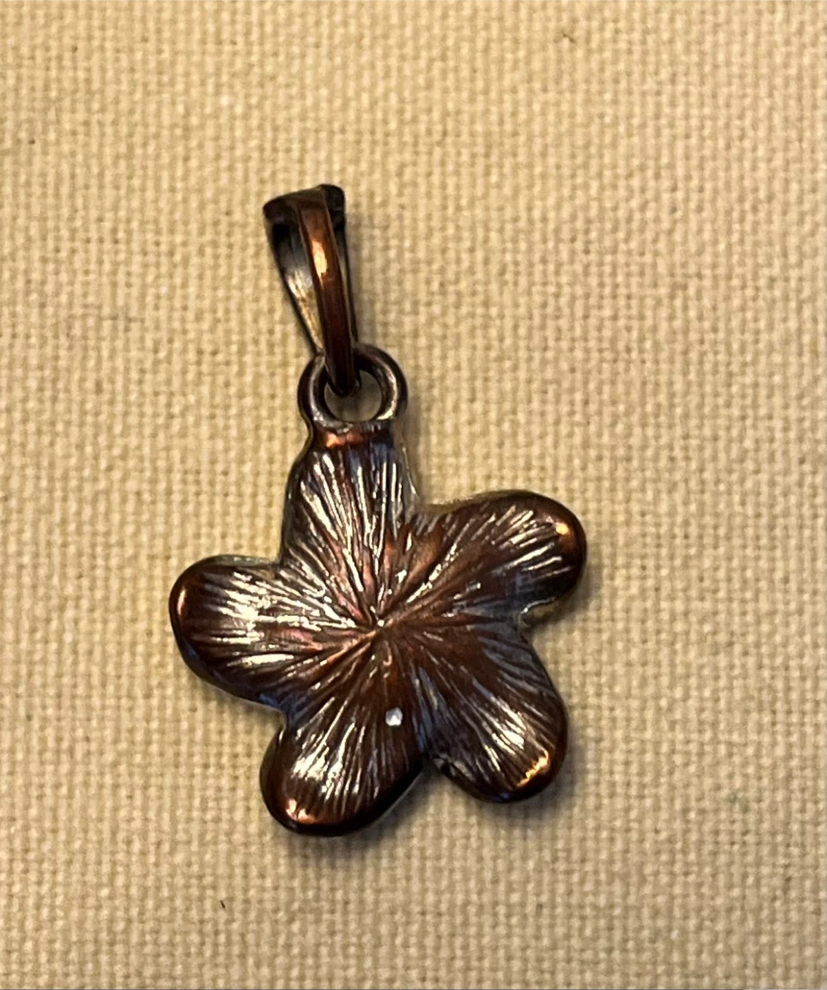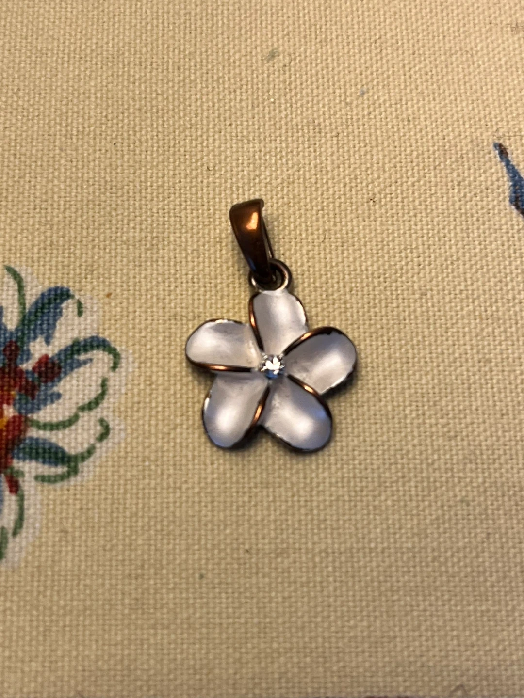 Selling a flower pendant. It's a five-petal flower with a gem in the centre. The pendant has a metal loop at the top for hanging on a necklace or bracelet