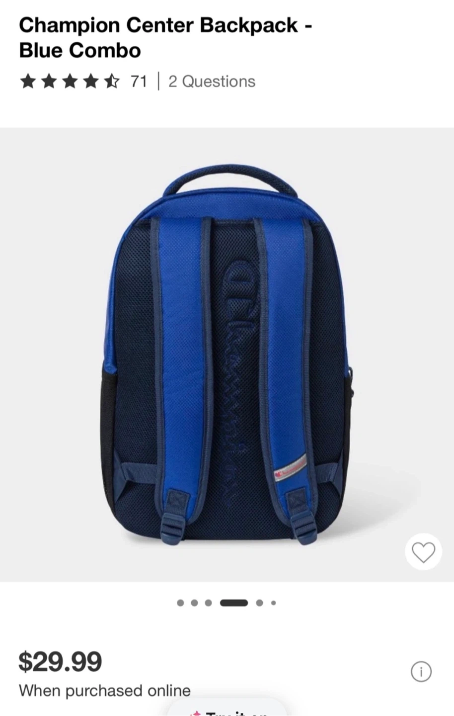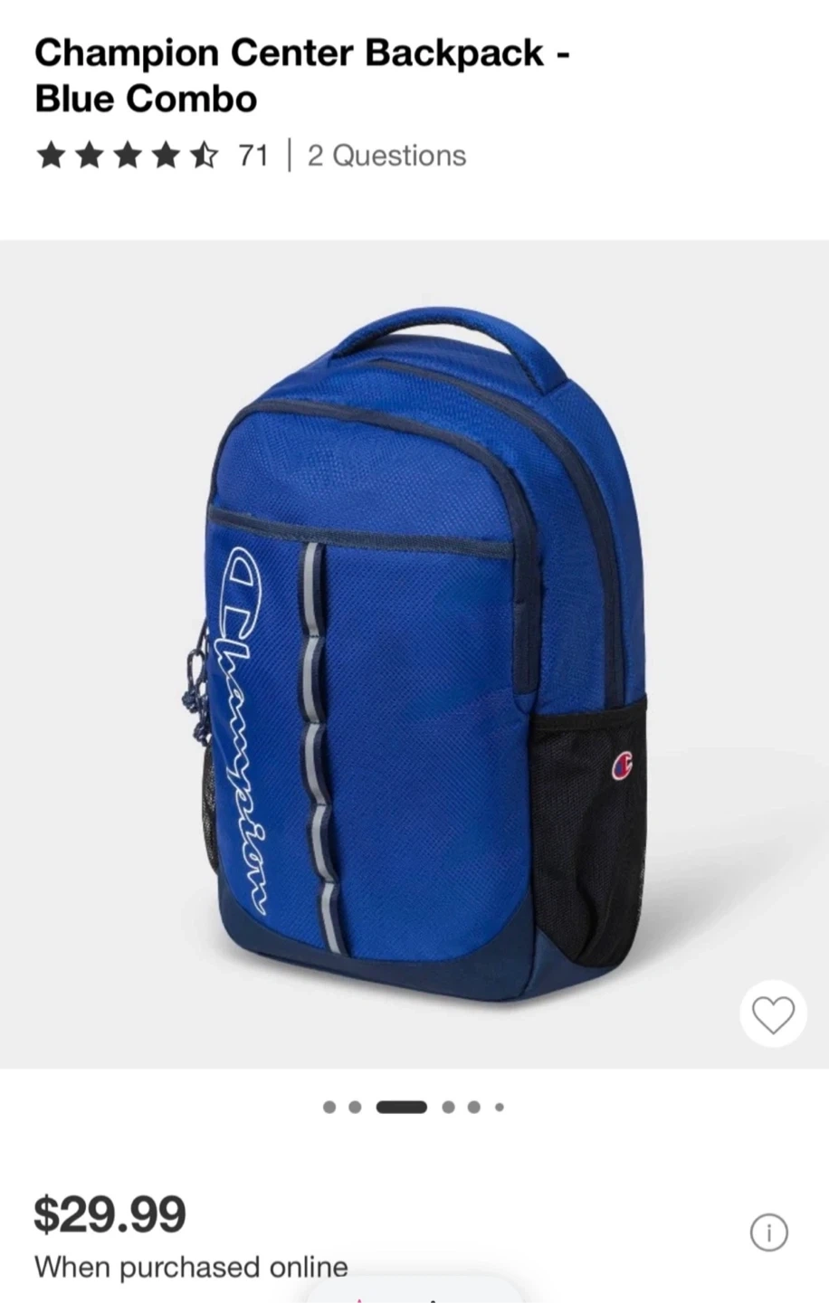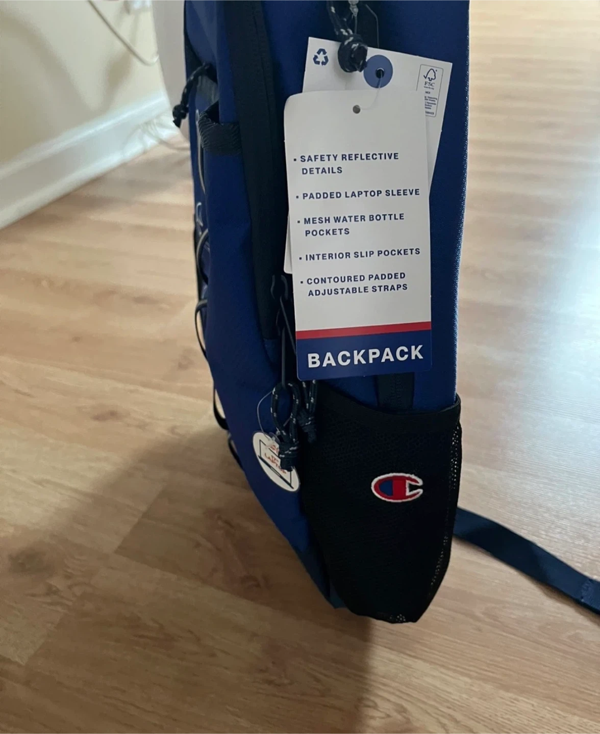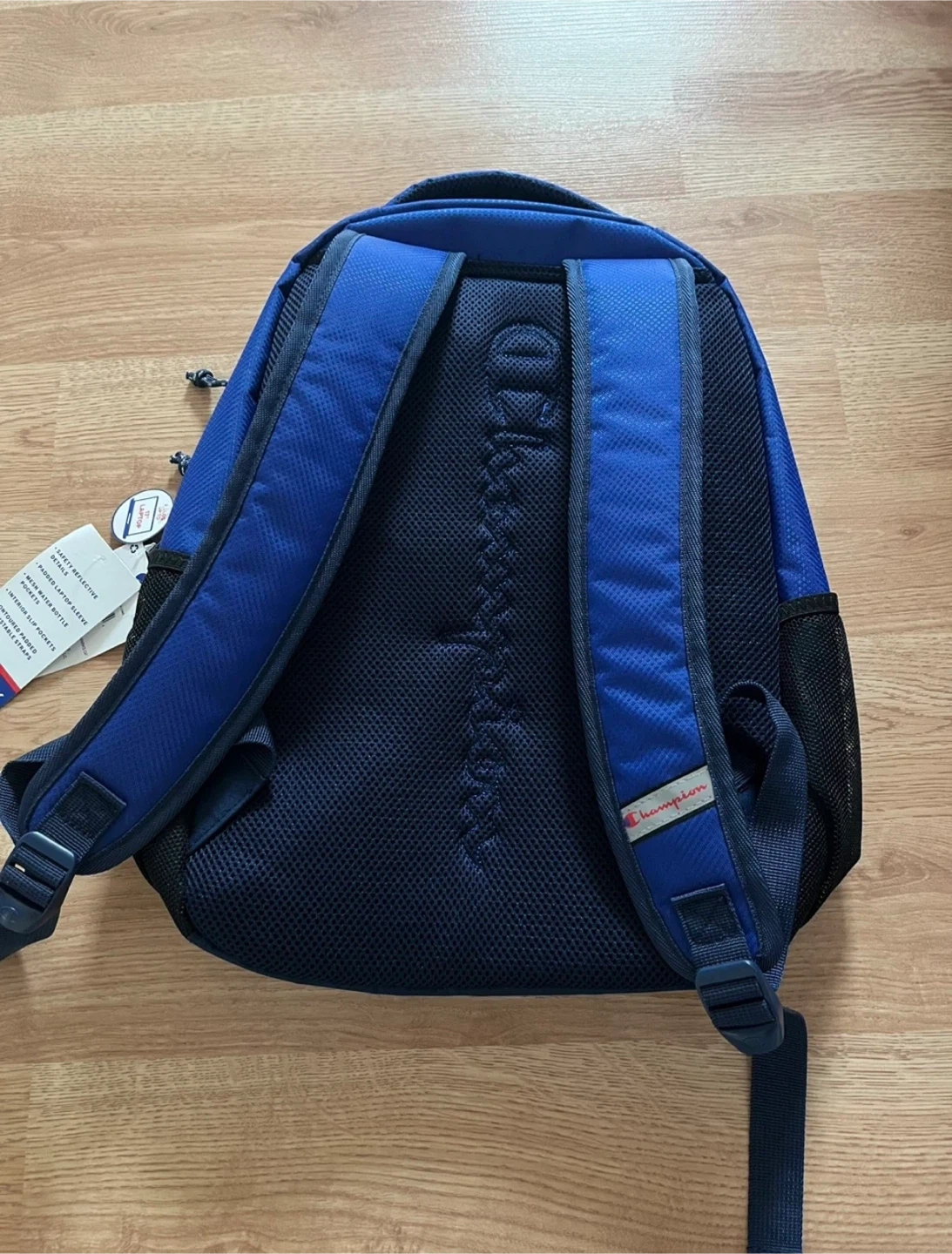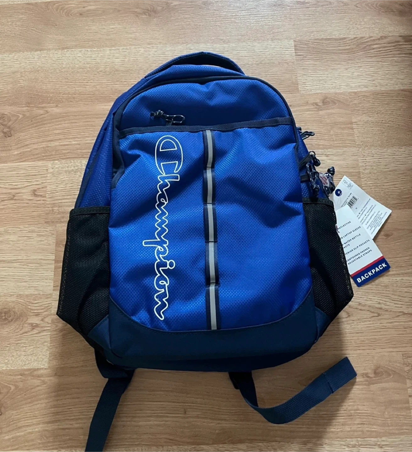 Champion Center Backpack in a nice blue combo color! This backpack has safety reflective details, a padded laptop sleeve, and mesh water bottle pockets. It also has interior slip pockets and contoured padded adjustable straps. Originally bought for $29.99