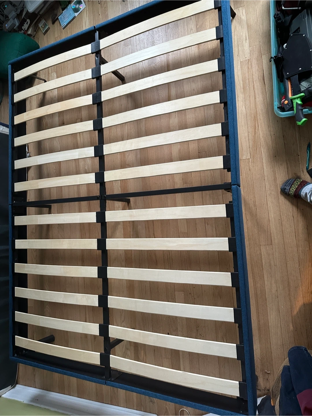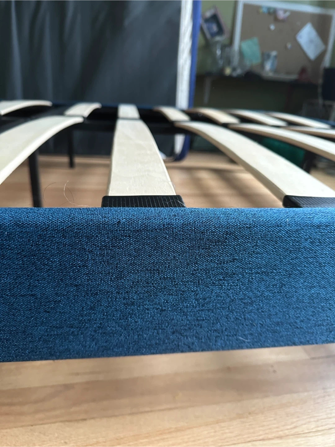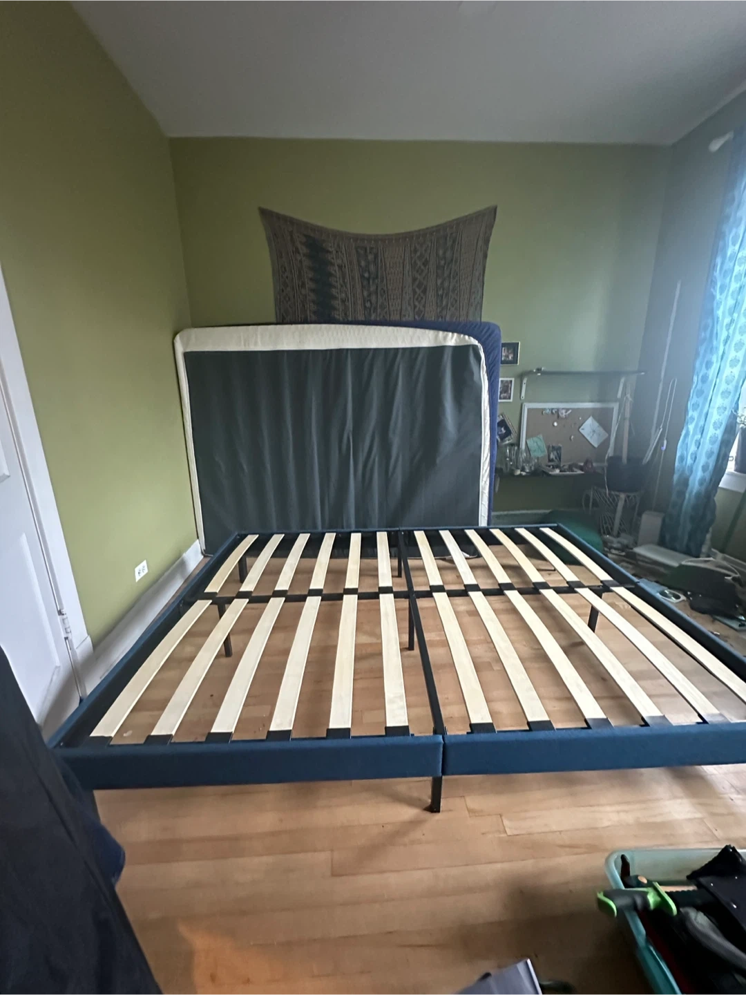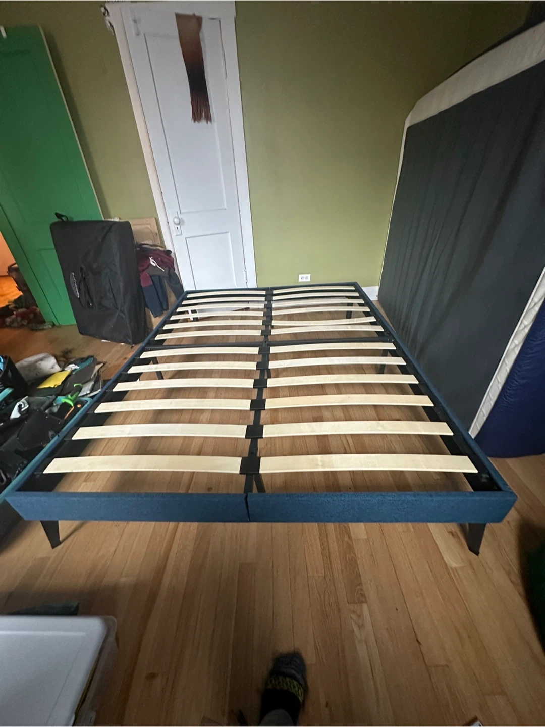 Selling a bed frame in good condition. It features a blue upholstered frame and wooden slats for support. Perfect for any bedroom! The only reason I’m selling it is because I have an old dog. It’s easier for her if my bed is lower to the ground.