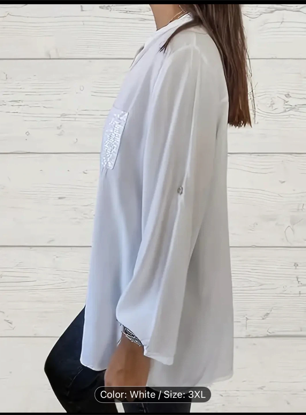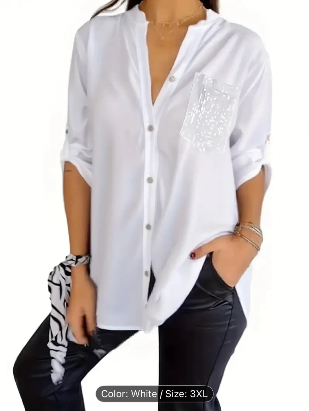 A lovely white blouse in size 3XL. It features long sleeves and a pocket detail. Perfect for a casual or dressed-up look!