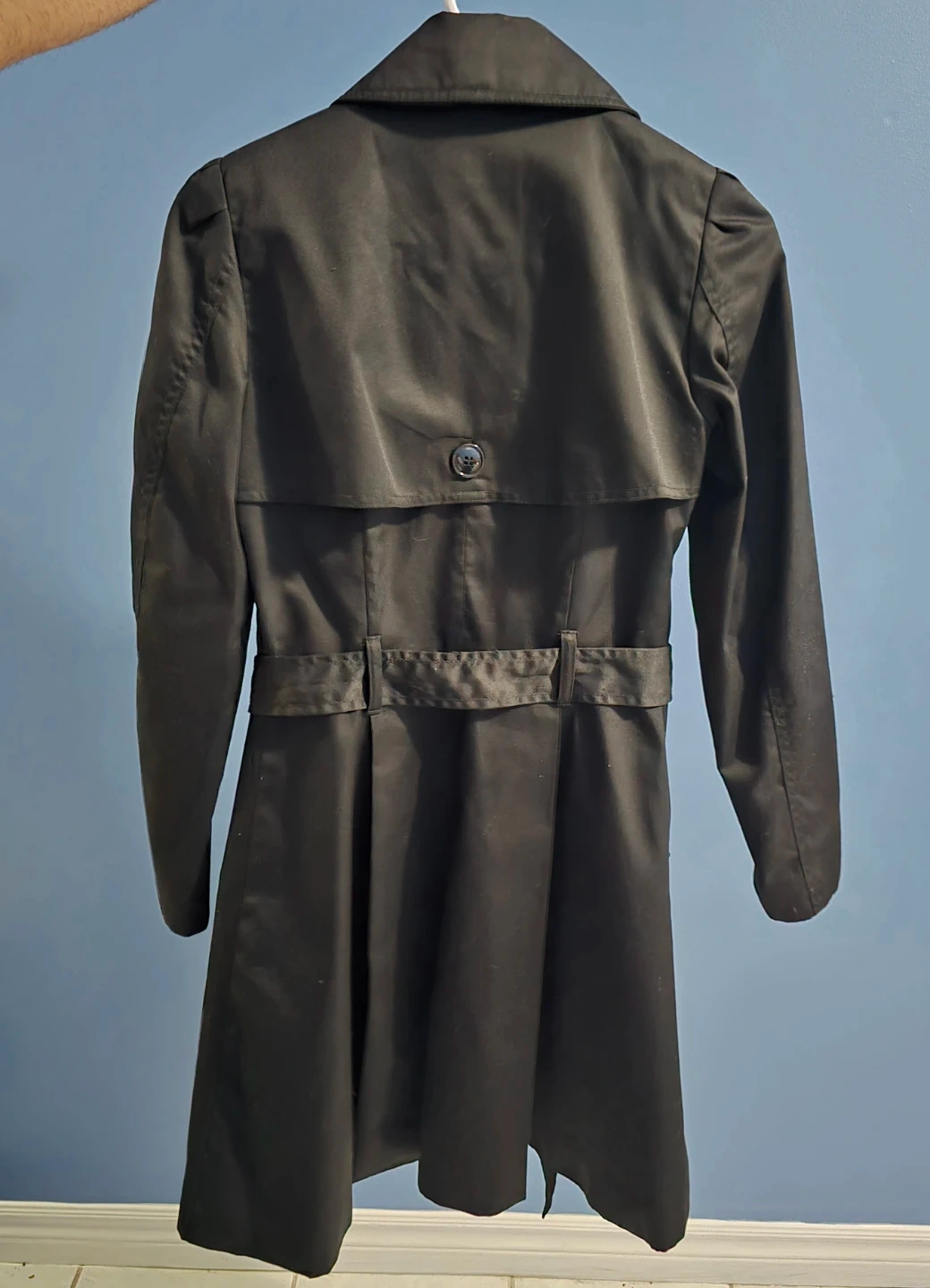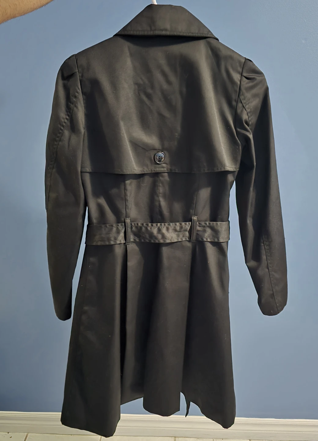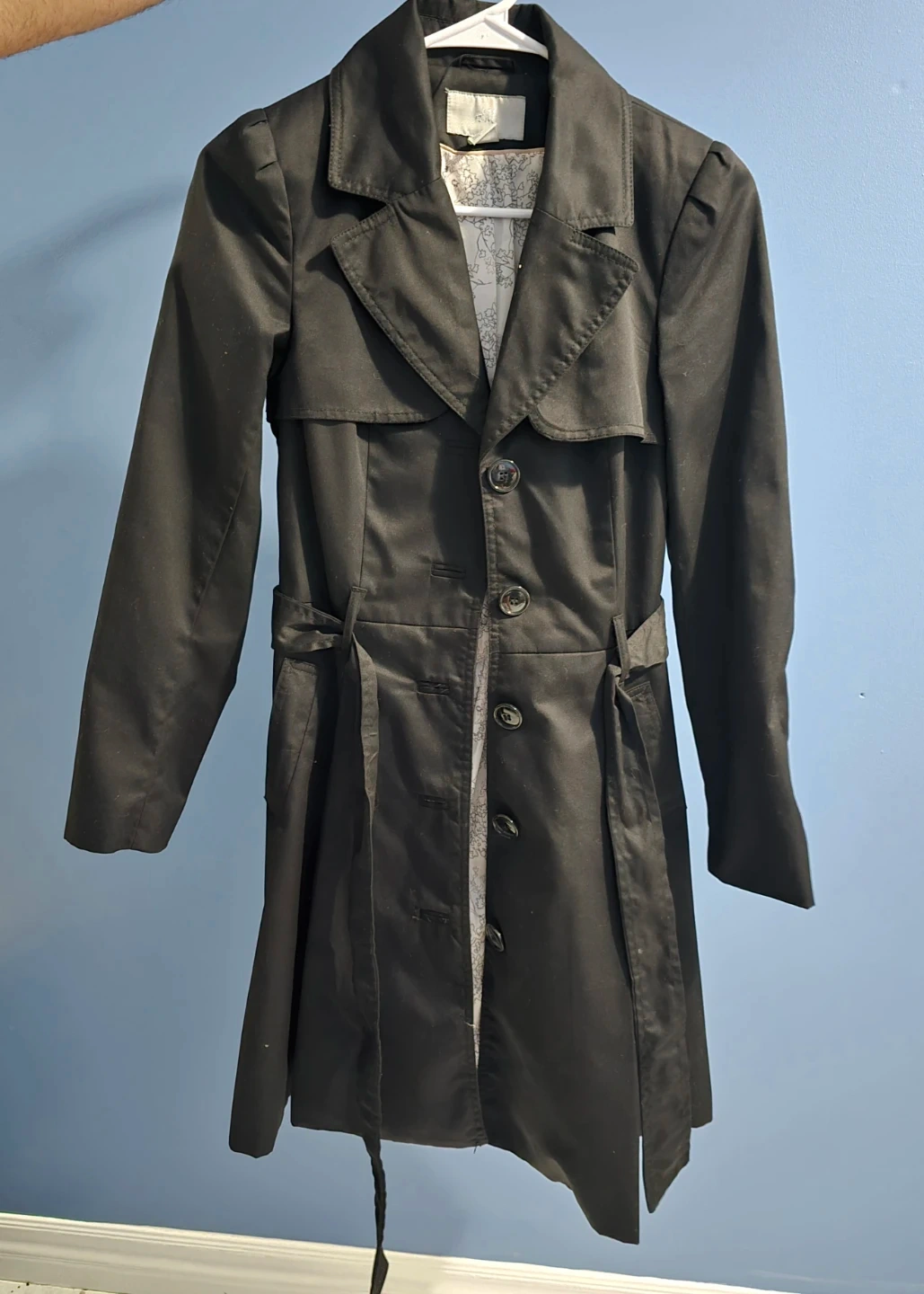 Selling a stylish black trench coat. It's in great condition and features a classic design with a belted waist. Perfect for adding a touch of sophistication to any outfit! Smoke and pet free