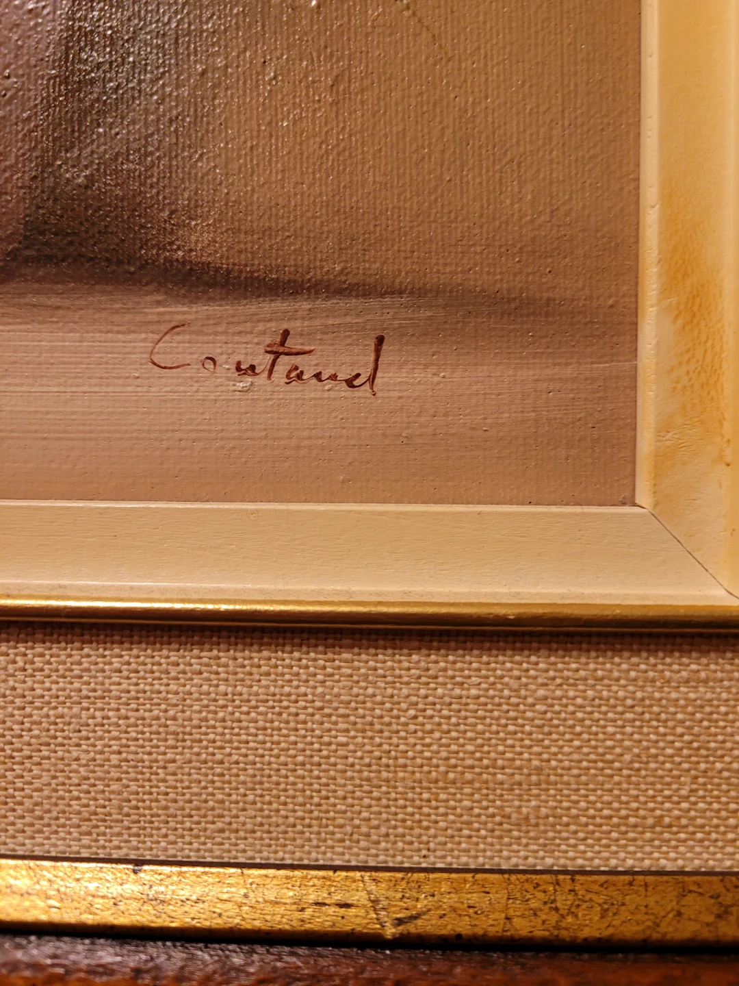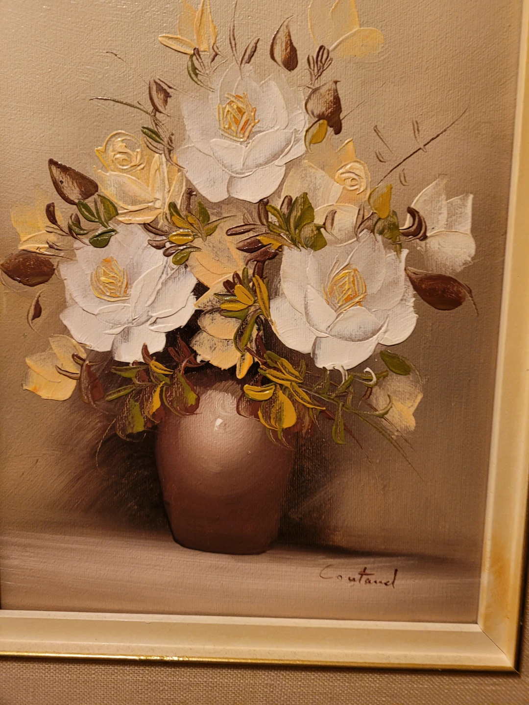 Here's a lovely floral still life painting, signed by Contaud! The painting features white flowers in a vase, with a neutral background and a framed edge. It would be a great addition to any room!