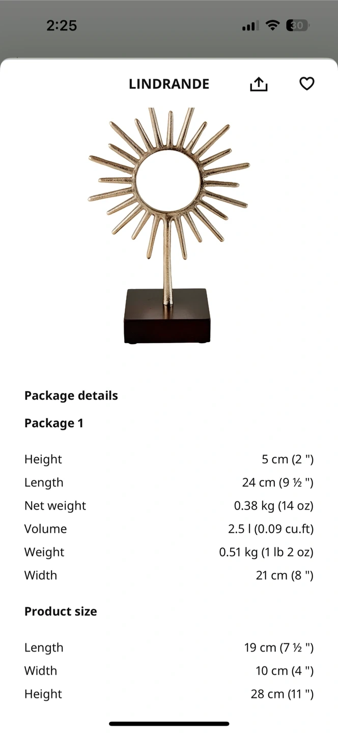Add a touch of sunshine to your space with this LINDDRANDE sun decoration! It features a beautiful brass colour and stands at 28 cm (11"). Like new, it’s been on a shelf since I bought it last year.