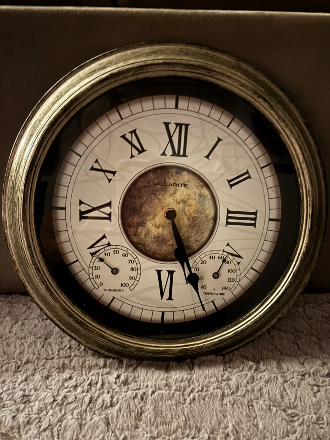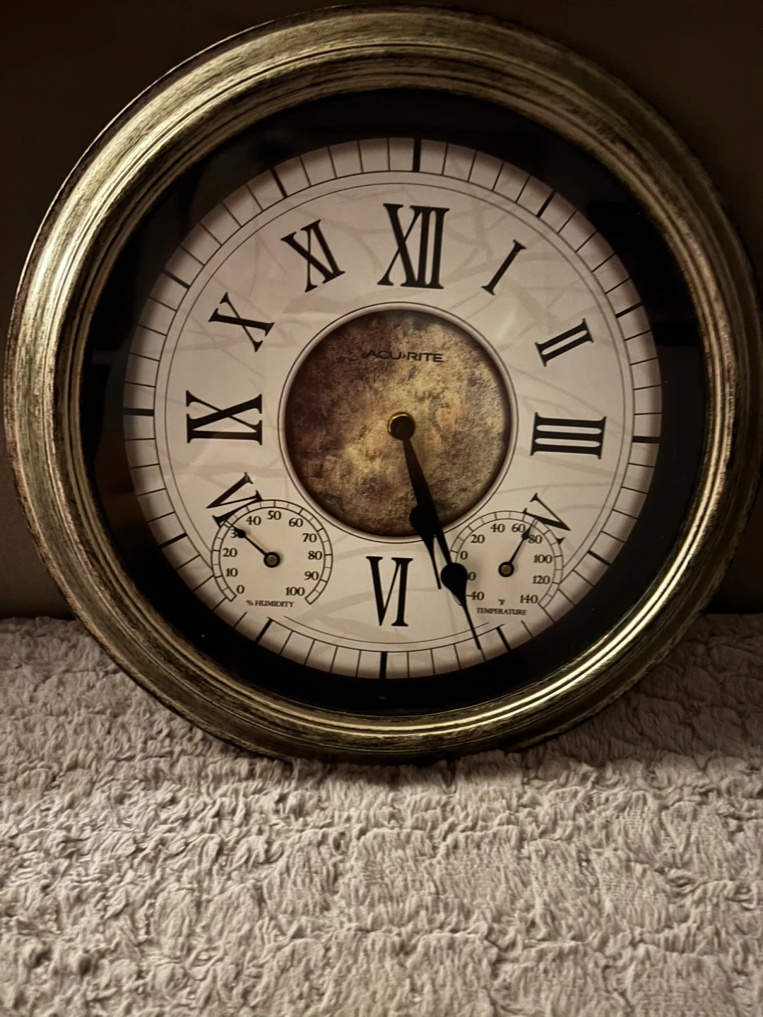 I'm selling an AcuRite wall clock! It features both temperature and humidity gauges, adding a functional and decorative touch to any room. The clock face has Roman numerals and a vintage-style design, perfect for a classic or rustic decor. It's in great condition and ready to be hung up!