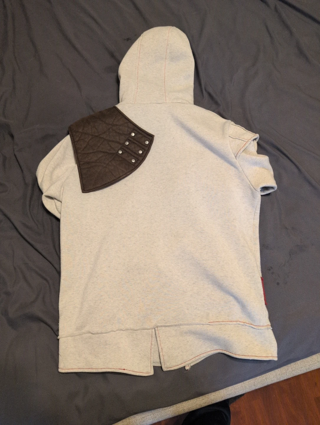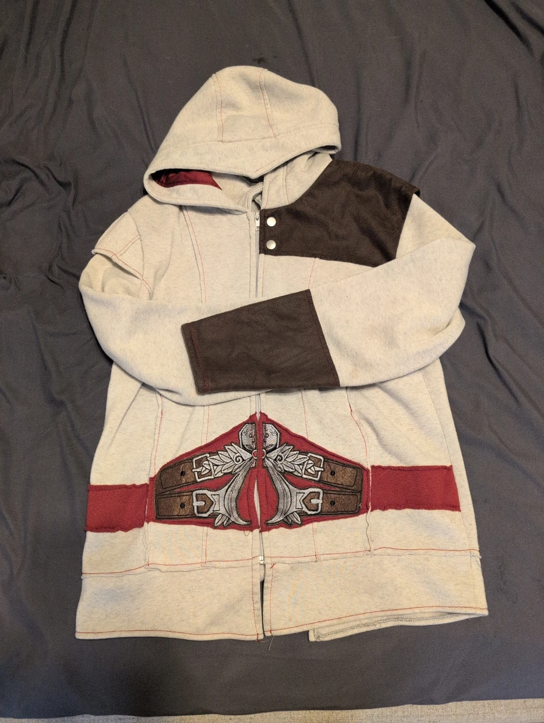 Selling a unique hoodie inspired by the Assassin's Creed game series! It features a distinctive design with brown and red accents on a light grey base. The hoodie has a full zipper and a hood, perfect for fans of the game or anyone looking for a standout piece. Size medium