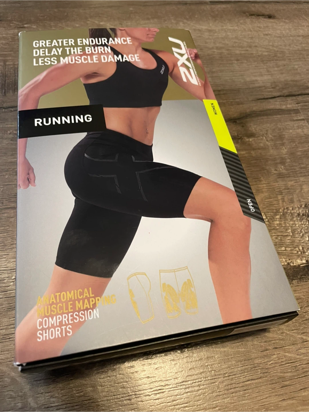 Selling a pair of 2XU women's running compression shorts in size L! These shorts are designed to provide greater endurance and delay muscle damage during your runs. They feature anatomical muscle mapping and compression technology. They come with the original box, making them perfect for anyone looking for high-quality athletic wear.