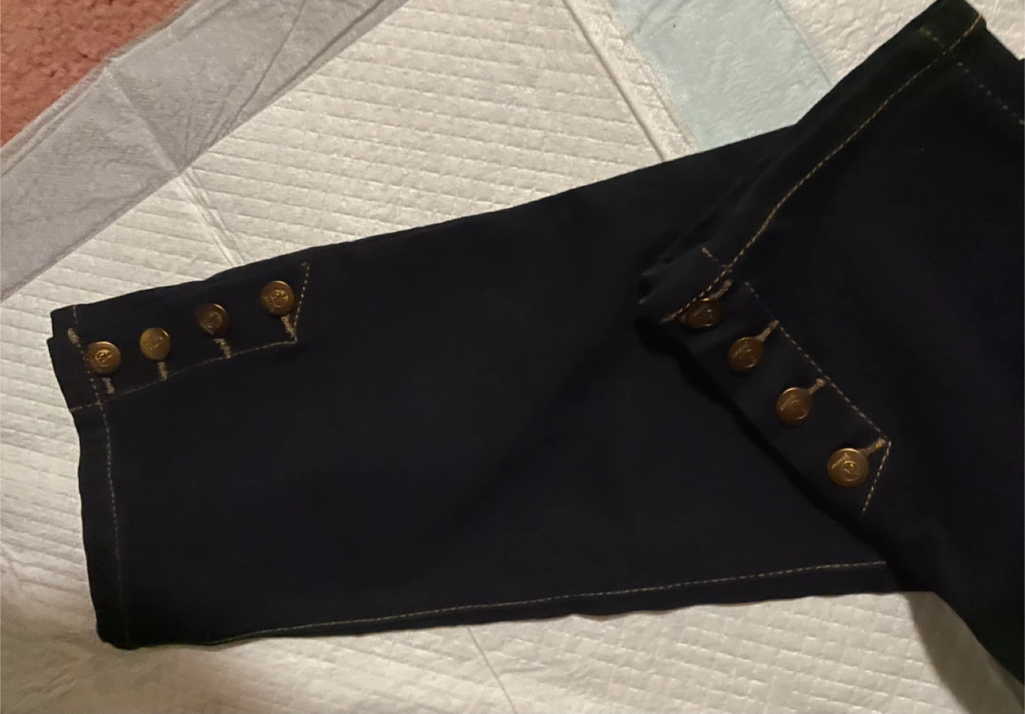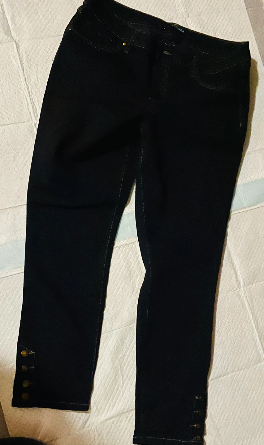 Selling a pair of d. jeans stretchy, navy blue jeans in size 14. They are made of 72% cotton, 26% polyester, and 2% spandex. These pants have a stylish design with buttons on the bottom Pick up Victoria park ave nth Lawrence Ave