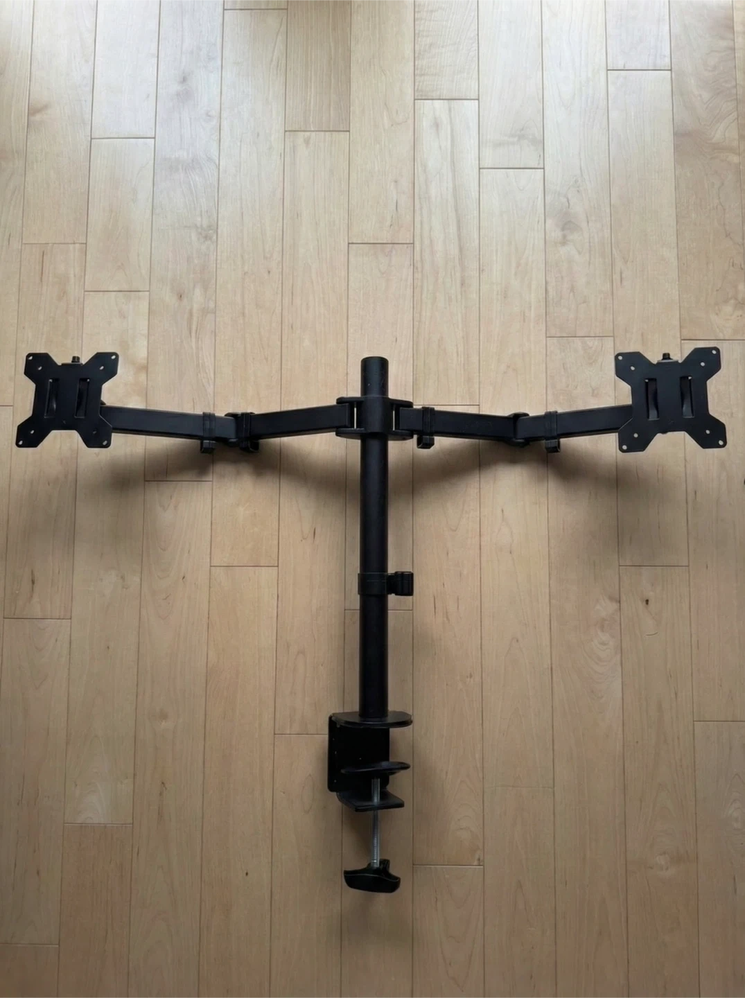 Selling a dual monitor desk mount stand in great condition! It's perfect for creating an ergonomic workspace. The mount is sturdy and can hold two monitors securely, helping you maximize your desk space and improve your posture