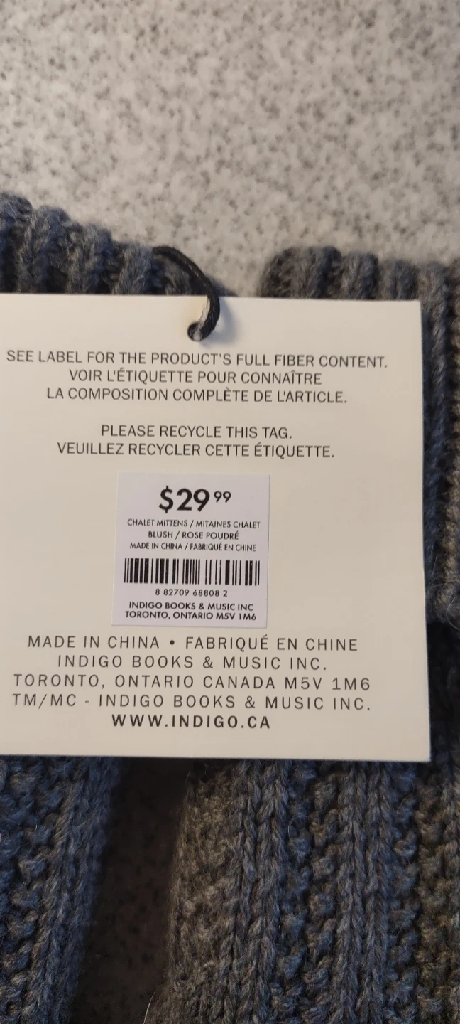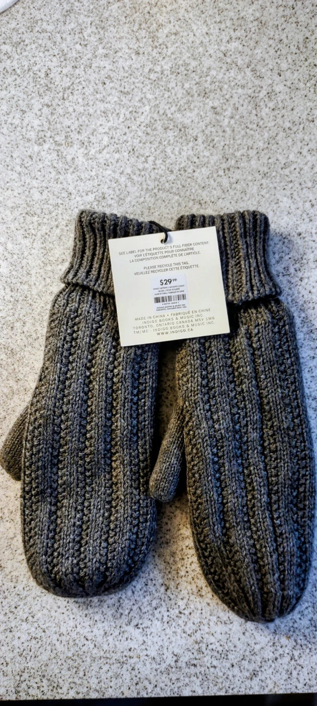Selling a brand new pair of Love & Lore Chalet Mittens! They're a lovely grey colour and look super cozy. The tag is still attached, and it shows they were originally $29.99 + tax. Indigo.