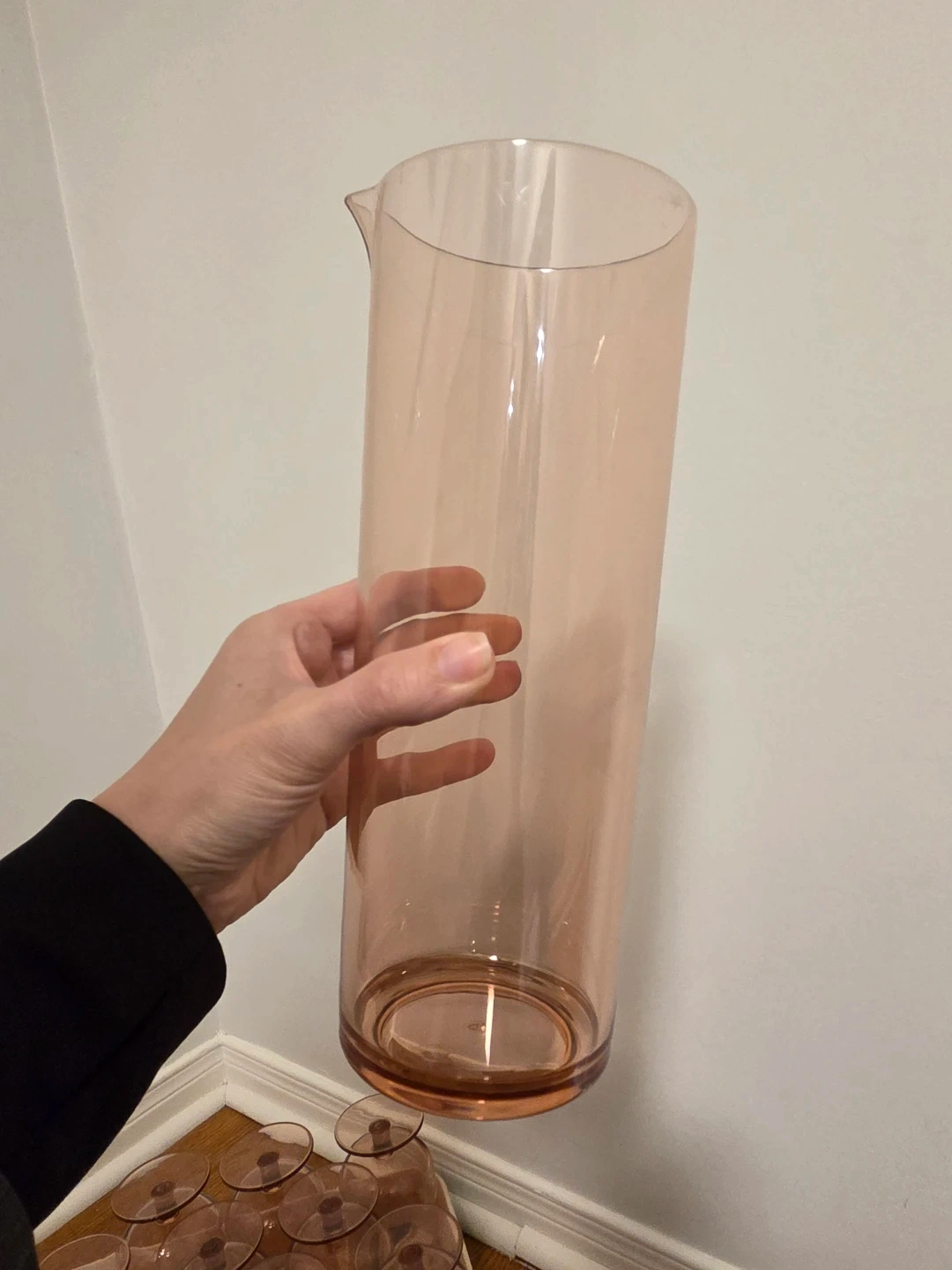 Selling a lovely pink drinkware set! Includes a tall pitcher, a tray with a leaf design, and ten matching cups. Perfect for adding a touch of colour to your kitchen or for entertaining guests. They are a strong plastic.