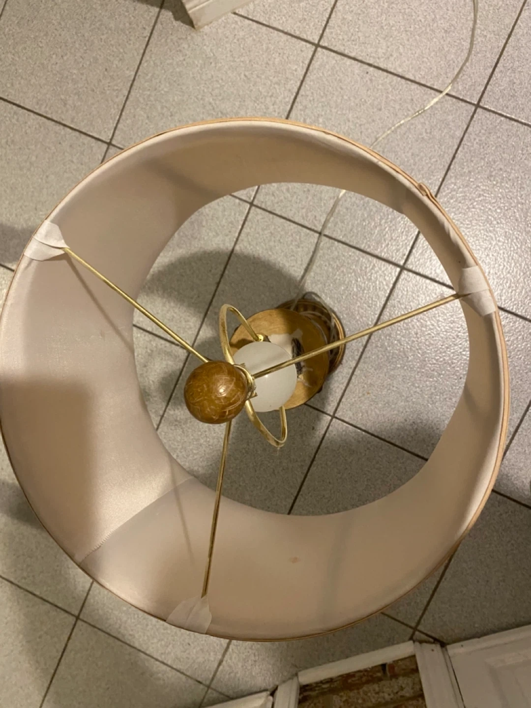 Selling a table lamp with a beige shade. It's in good condition and would look great in any room. The base has a unique design.