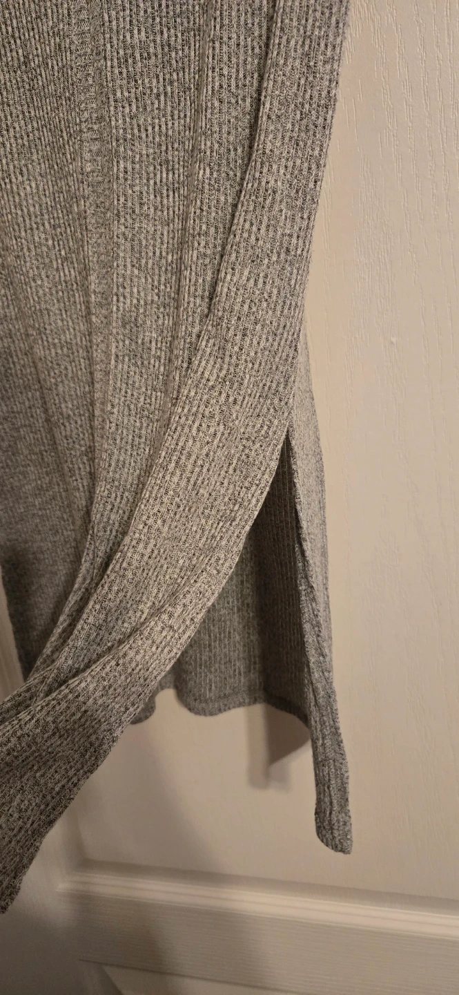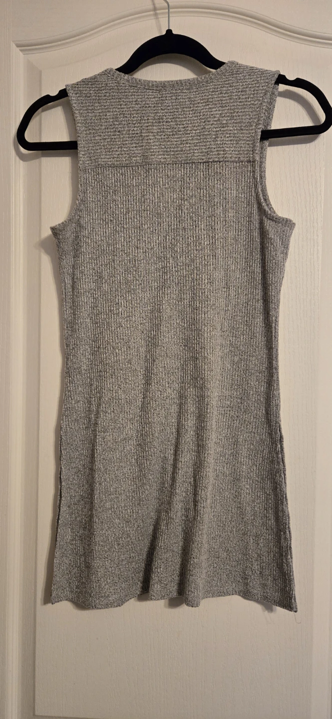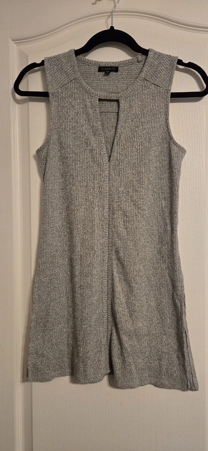 This is a cute grey sleeveless dress from Dynamite! It's in great condition and perfect for summer days or layering in cooler weather. The dress has a unique neckline and a comfortable fit!