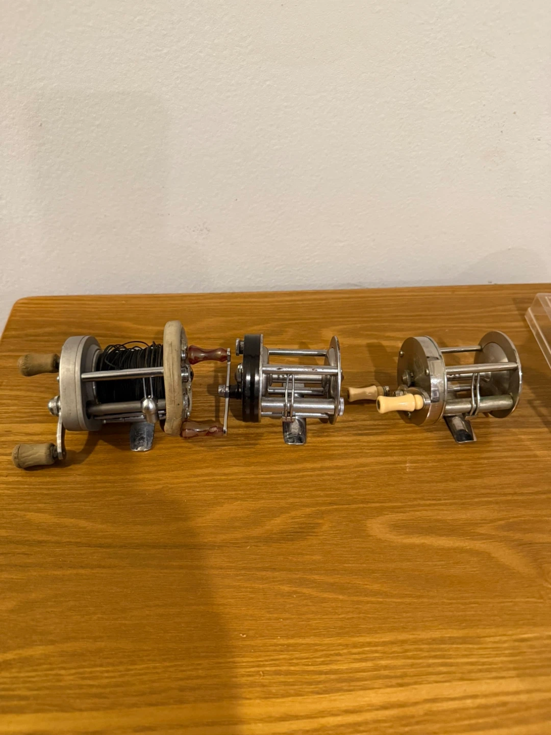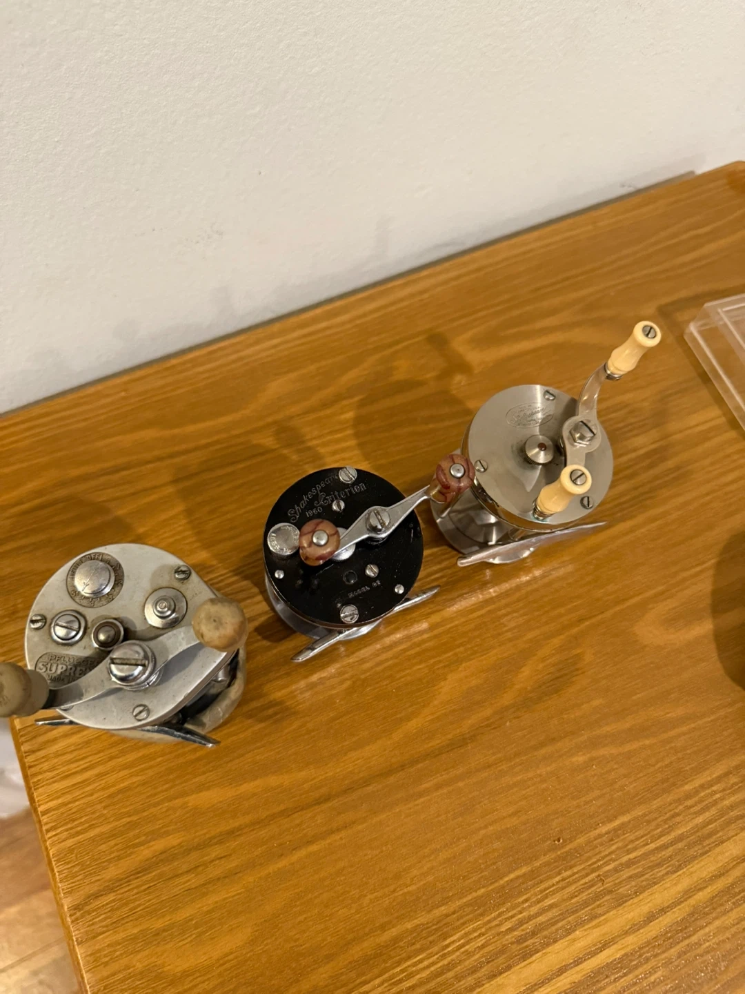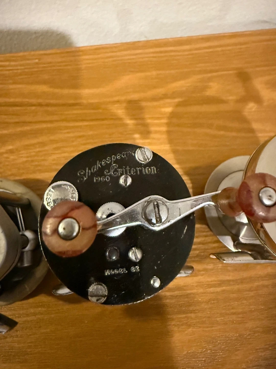 Selling a set of vintage fishing reels. Includes a Pflueger Supreme reel and two Shakespeare reels, one of which is a Criterion model. Great for collectors or fishing enthusiasts!
