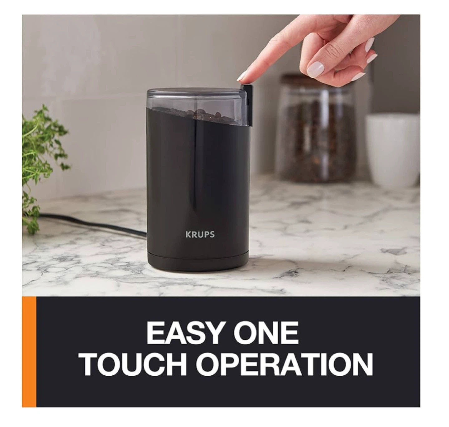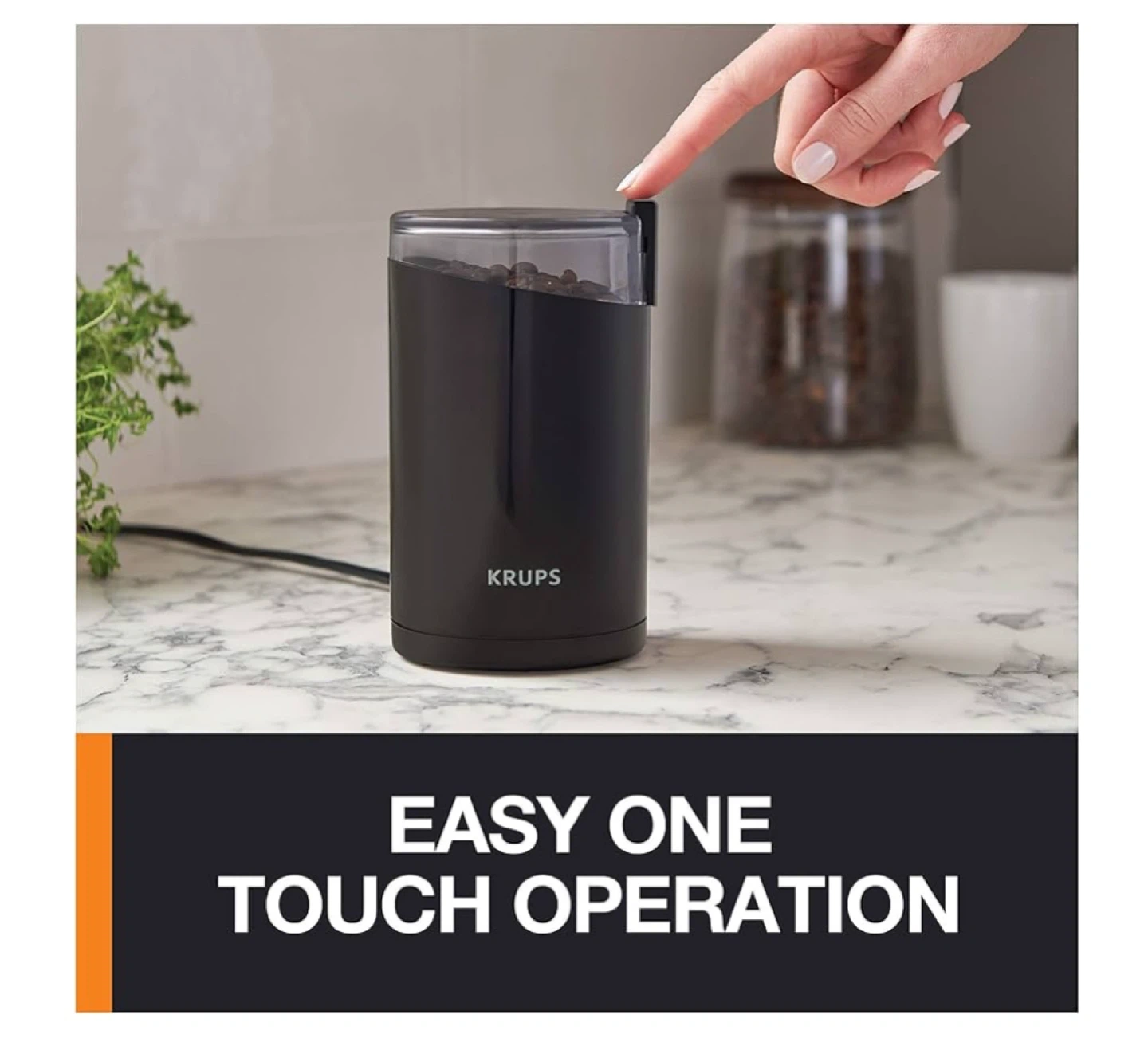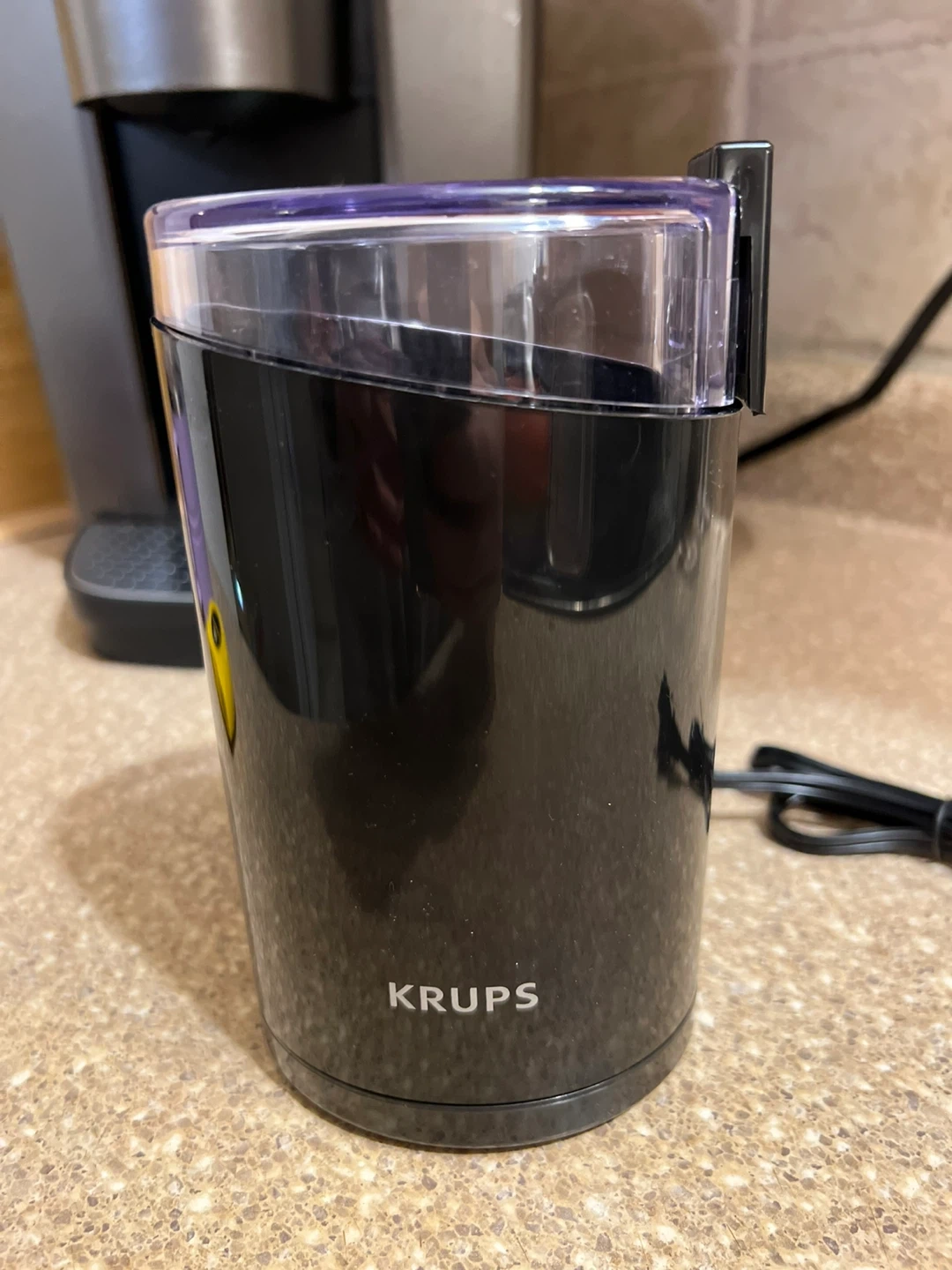 I'm selling a Krups Fast Touch Coffee Grinder in black. It has a large capacity that holds 3 oz of beans. This grinder powerfully grinds from coarse to fine in seconds and has an easy one-touch operation. It also perfectly grinds spices, nuts, and herbs. It originally retailed for $40