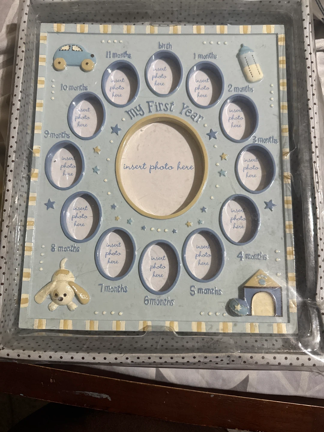 Capture those precious first-year memories with this adorable baby photo frame! It has spaces to insert photos from birth to 11 months, plus a larger spot for a special 'My First Year' photo. The frame is decorated with cute baby-themed embellishments like a car, bottle, and puppy