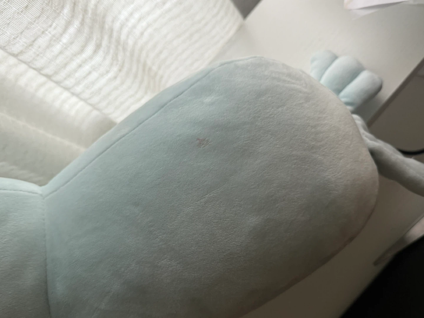 Selling a cute light blue seal plush toy! It's in good condition, perfect for cuddling or as a decorative piece. There is a small red stain on the back. There is also a small tear near the face.