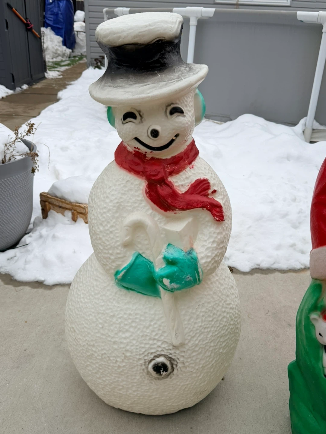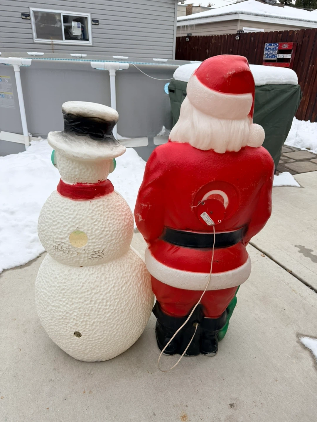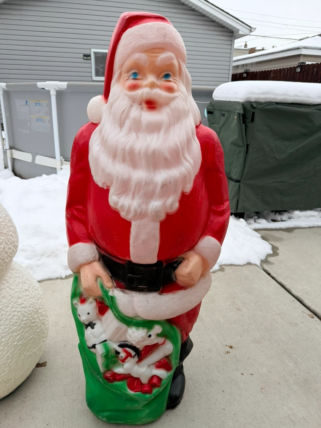 Selling a Vintage Union Frosty the Snowman & Empire Santa Claus Blow Mold figures. It's a charming piece of holiday decor. The Santa is holding a green bag filled with toys. There are some signs of wear, but overall it's in good condition for its age. Frosty is missing Pipe and needs a light.