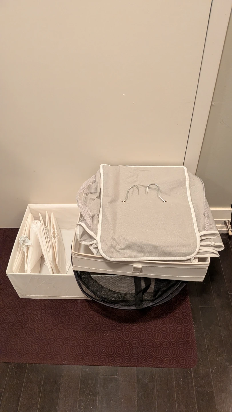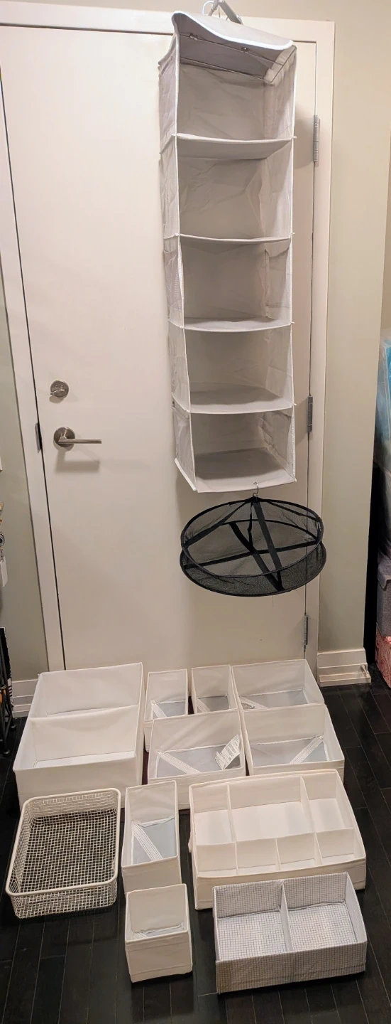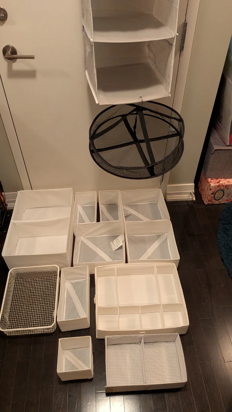Declutter your space with this set of storage solutions! Includes a variety of white storage baskets and hanging organizers to maximize your storage space. Perfect for closets, shelves, and drawers.