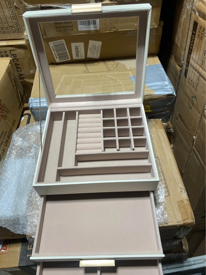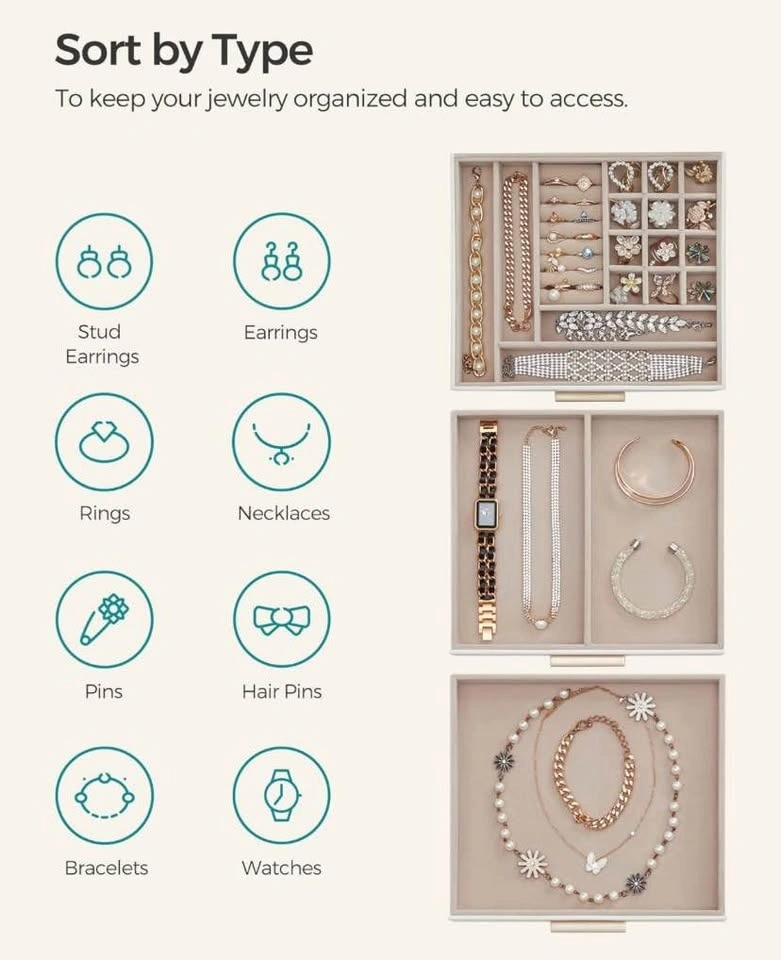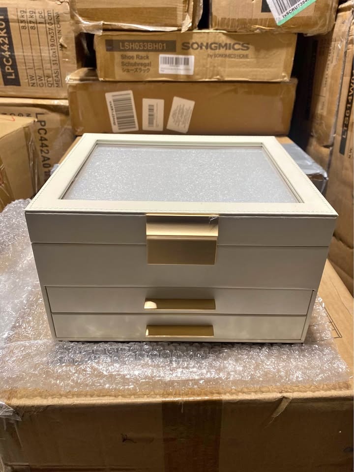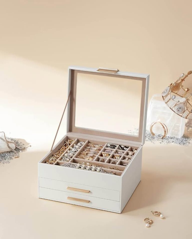 Meet the SONGMICS 3-Layer Jewelry Box Organizer — the perfect blend of elegance and function. With a clear glass lid, two smooth drawers, and a modern cloud white & gold finish, this organizer keeps your jewelry beautifully displayed and neatly stored.