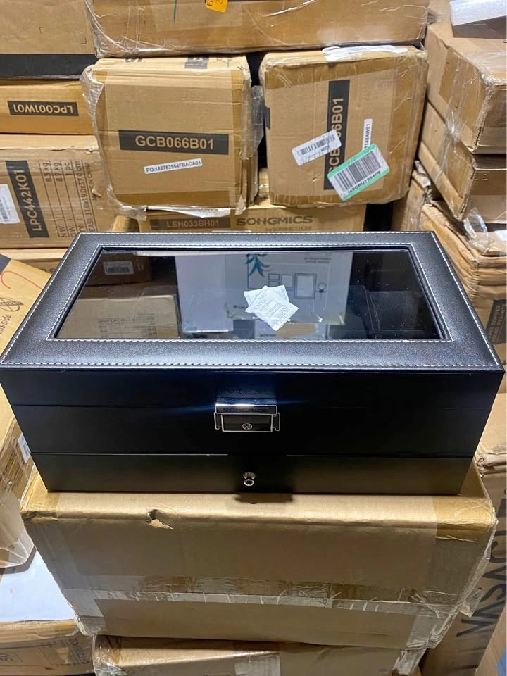 Crafted with sleek black synthetic leather, a large clear glass lid, and a soft black lining, this watch case adds a touch of luxury to any dresser or closet.