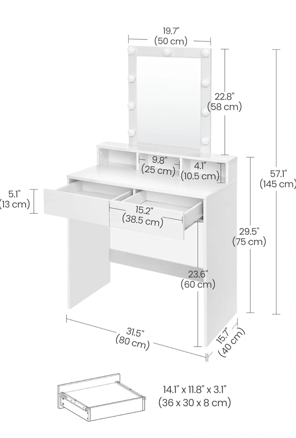 - Open shelf, 3 compartments, large tabletop, and 2 drawers to keep all your beauty products organized