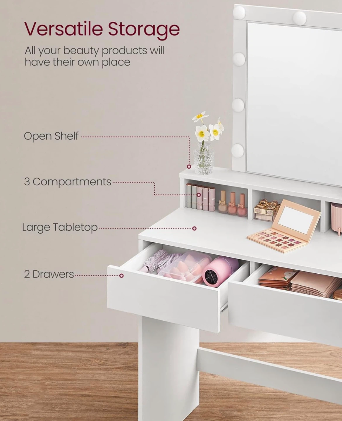 Looking to add a touch of glam to your space? This VASAGLE vanity table is perfect! It comes with a lighted mirror and offers versatile storage options.