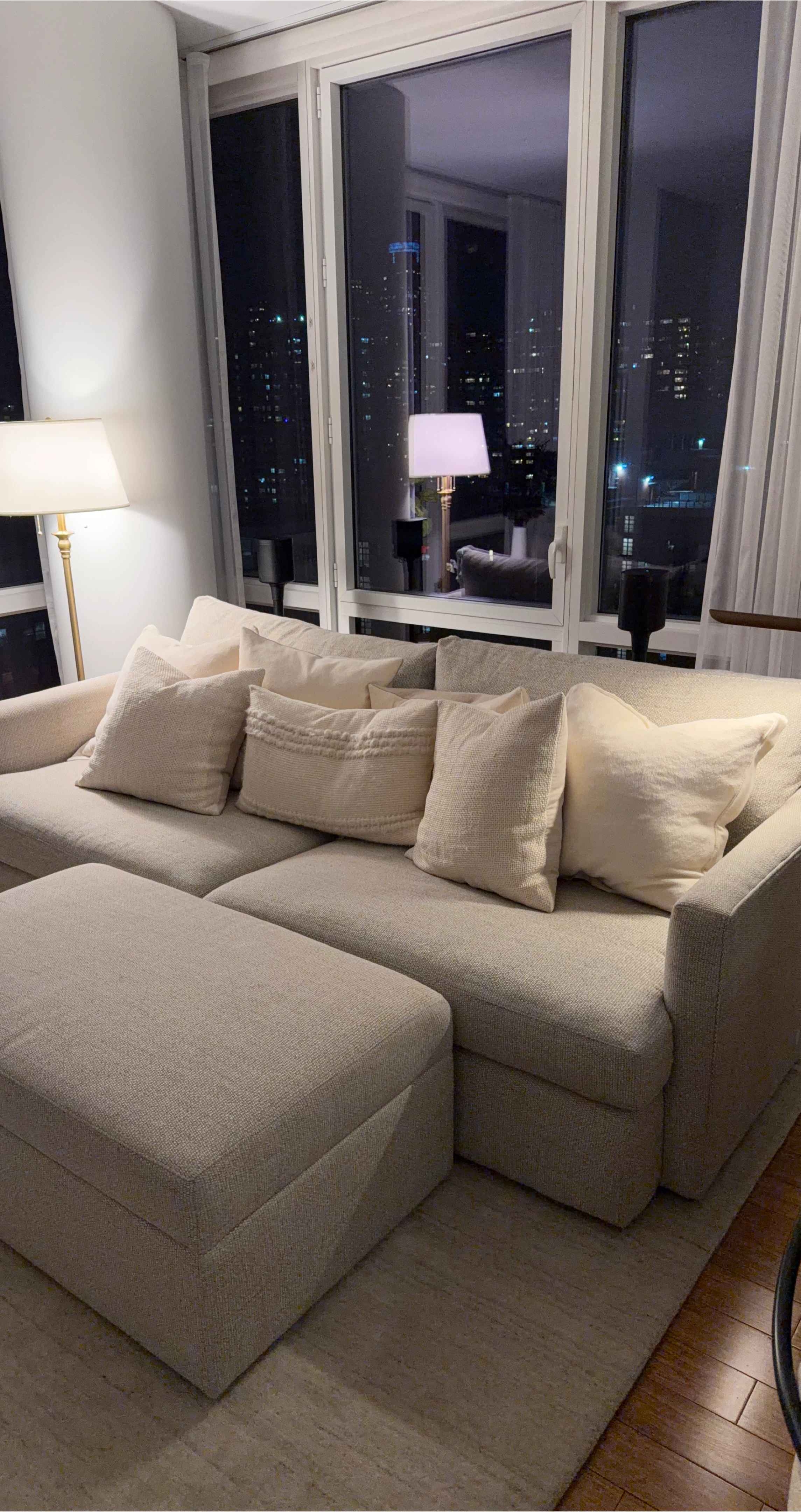 Selling a comfortable beige sofa with a matching ottoman. It's in great condition and would be a lovely addition to any living room!