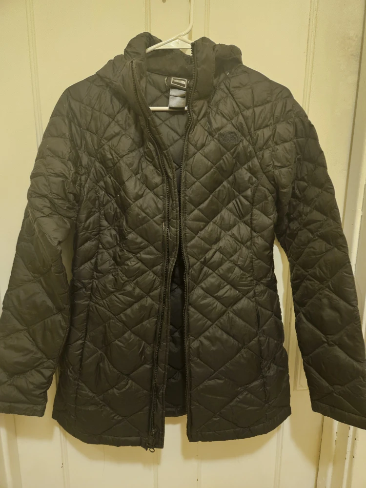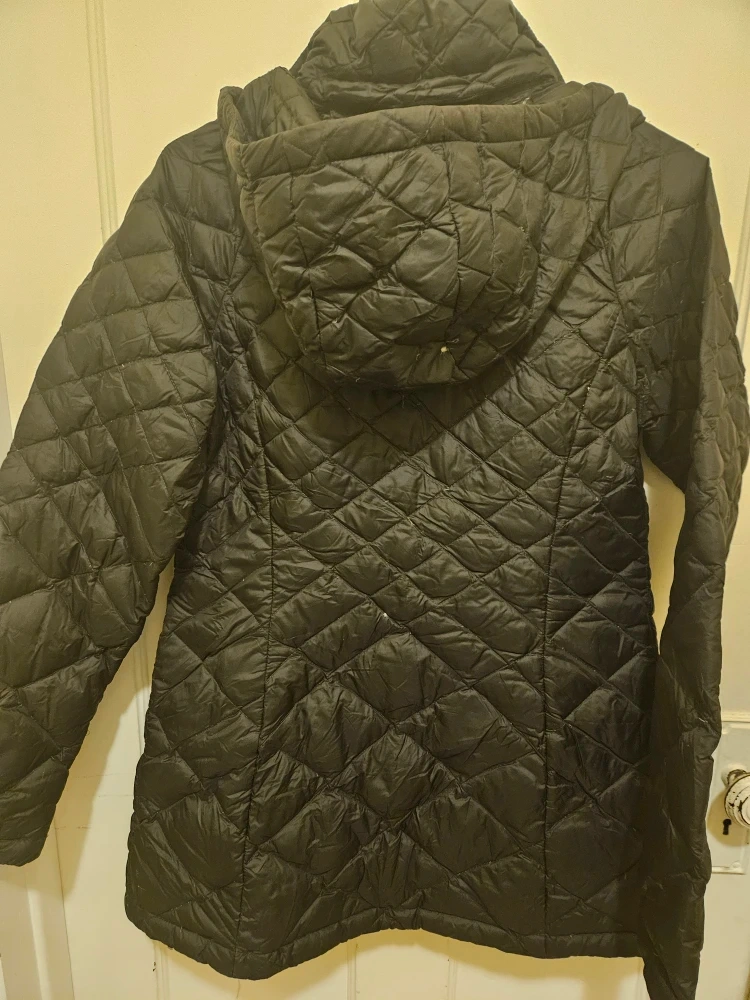 Selling a The North Face women's jacket in black. It's a size small and made with 100% recycled nylon lining and 100% polyester insulation with goose down. Perfect for staying warm!