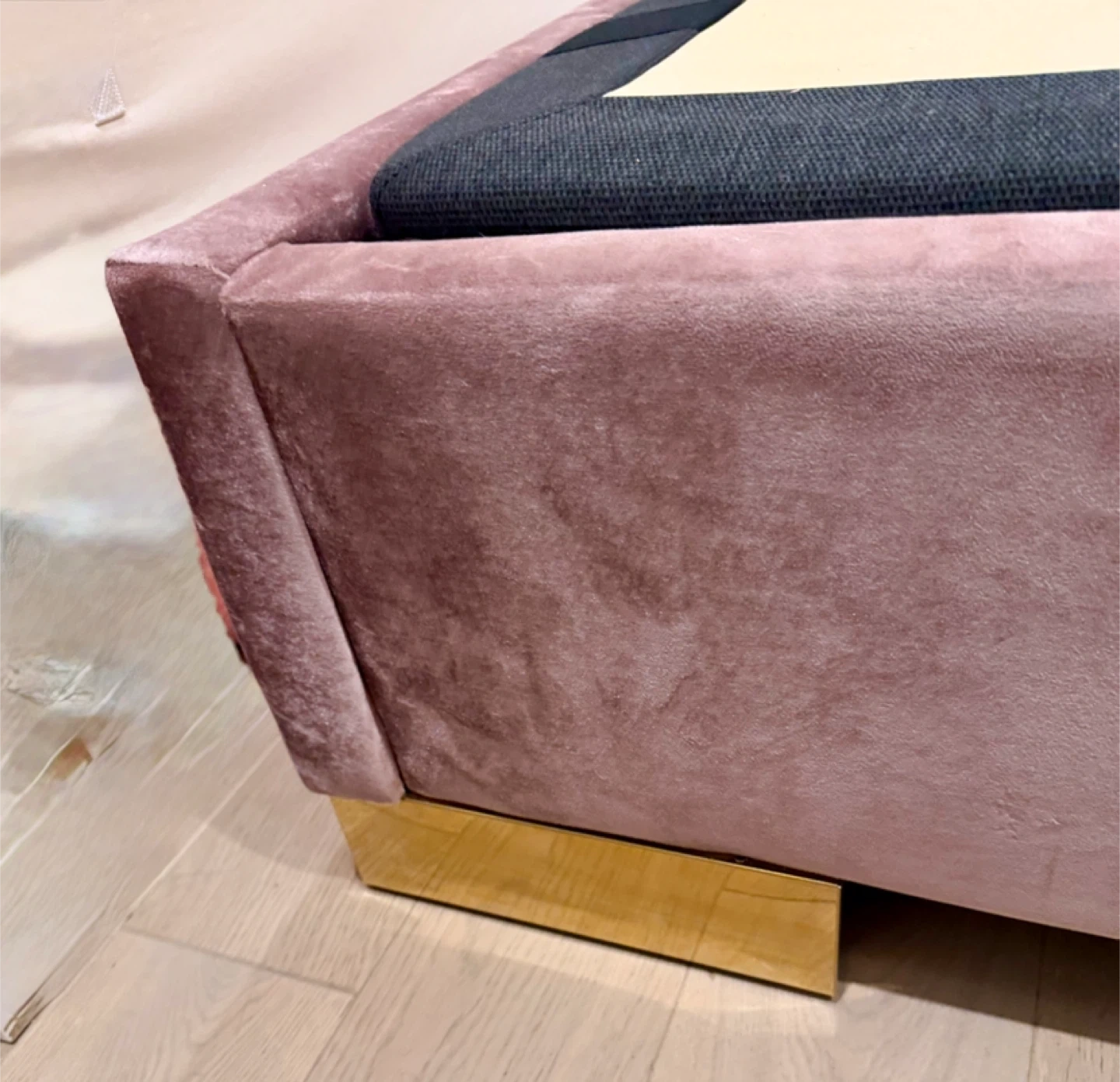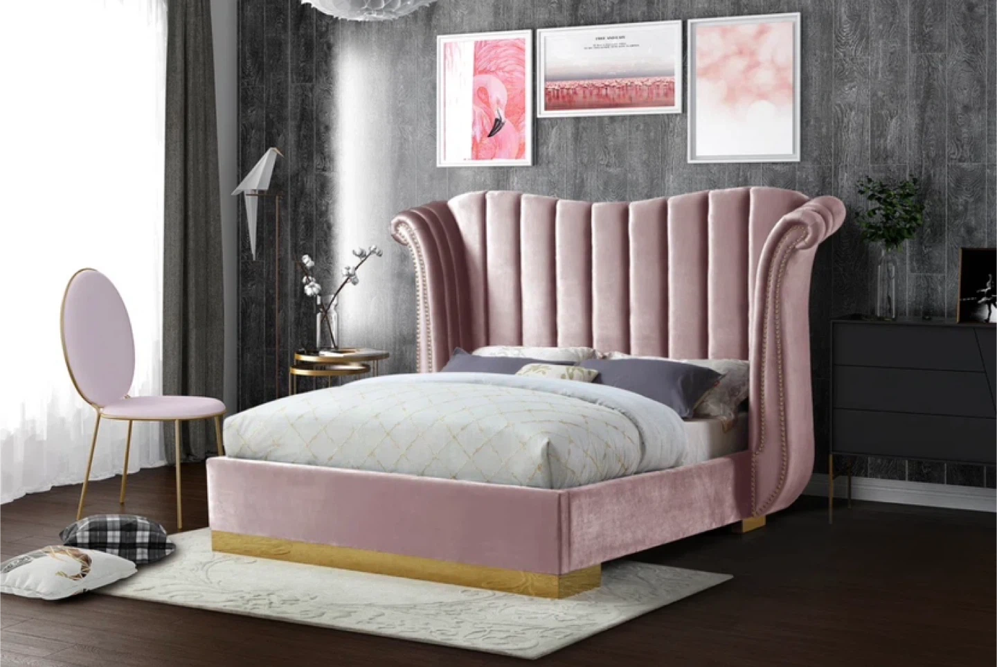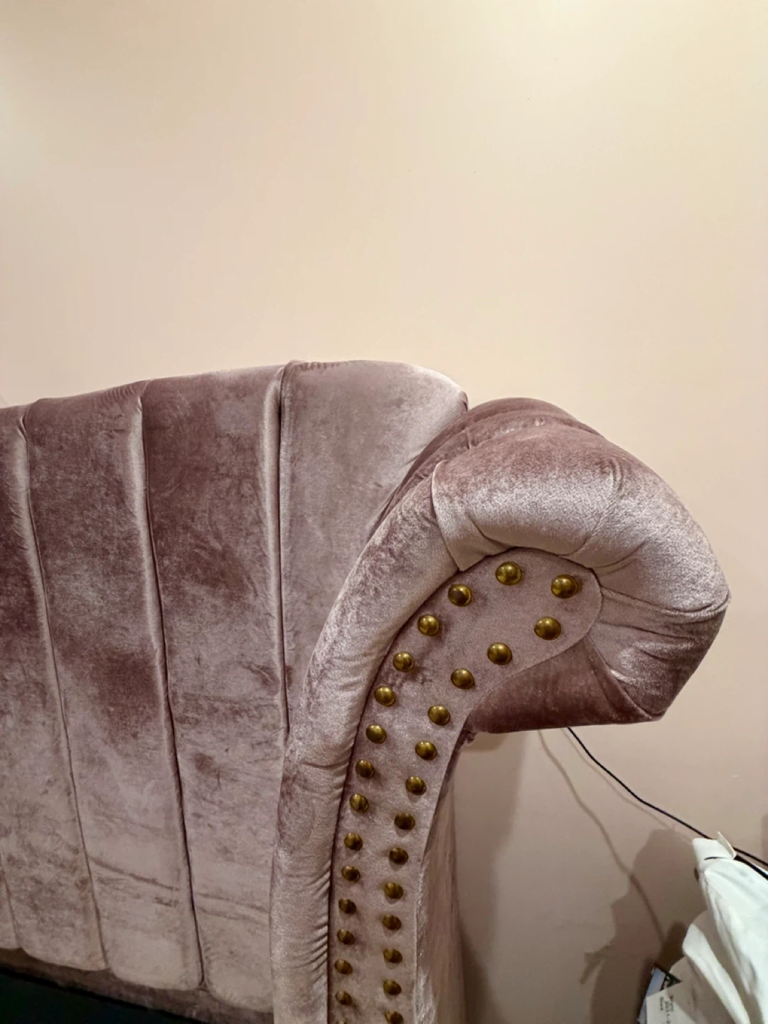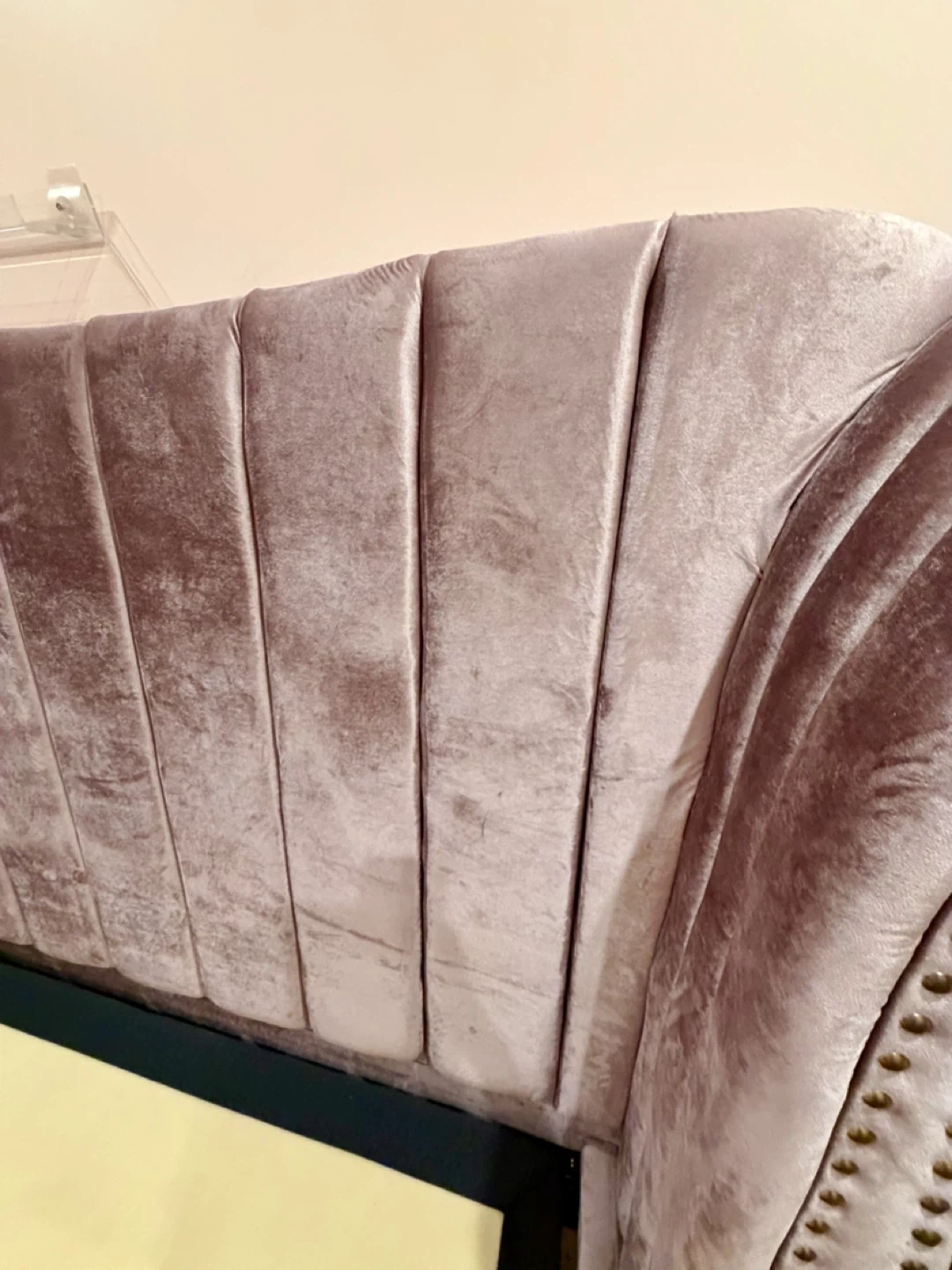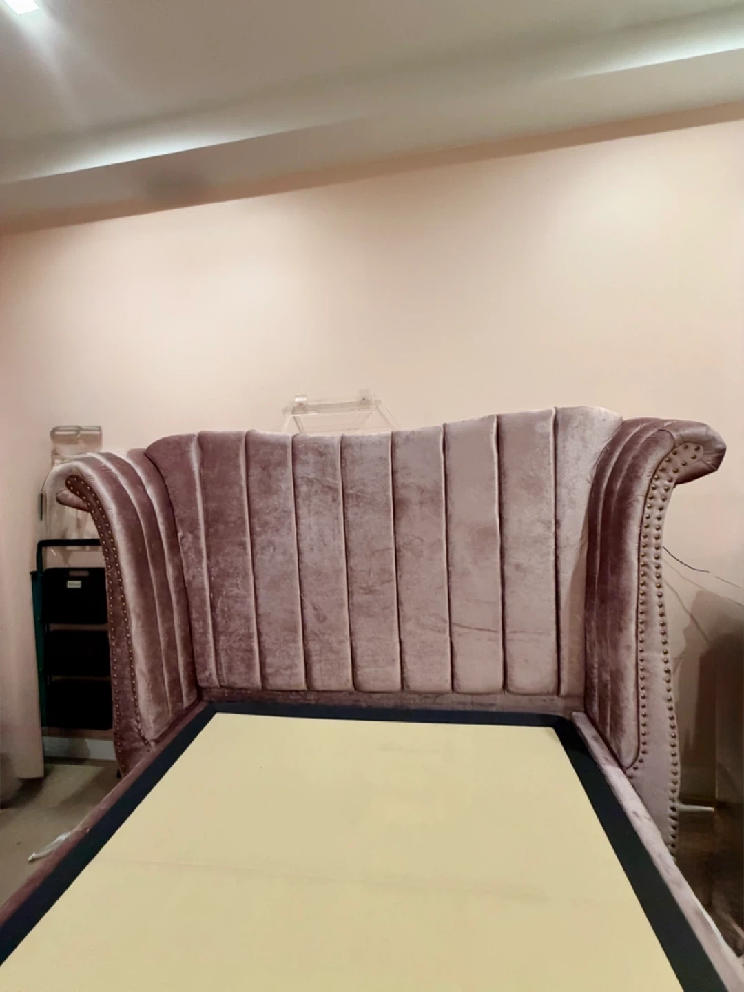 Selling a stylish pink velvet wingback bed frame. Dimensions are approximately 88" x 82.5" x 63.5". It was originally bought for $1,390
