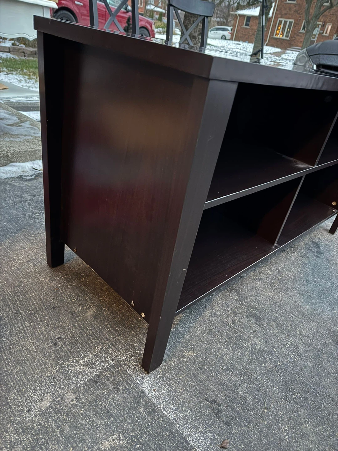 I'm selling a dark brown TV stand with shelving. It's in good condition and ready to hold your TV and media components.